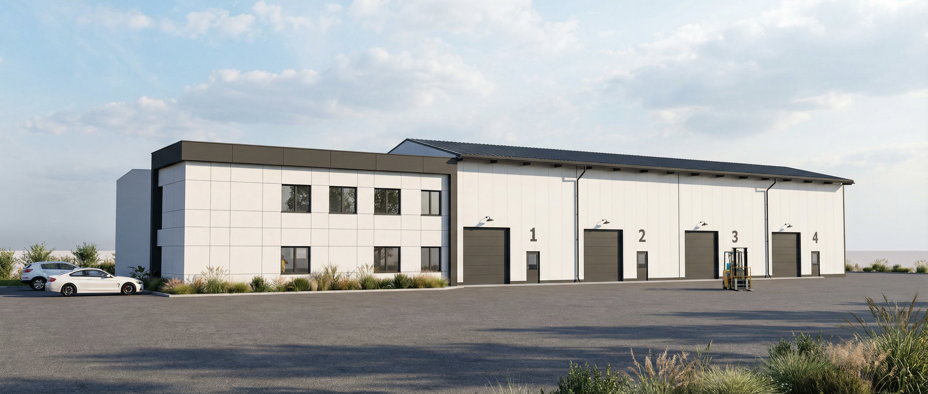 the left and right modules have white standing seam wall cladding and white roof while the middle part should have black standing seam meatal cladding and black roof