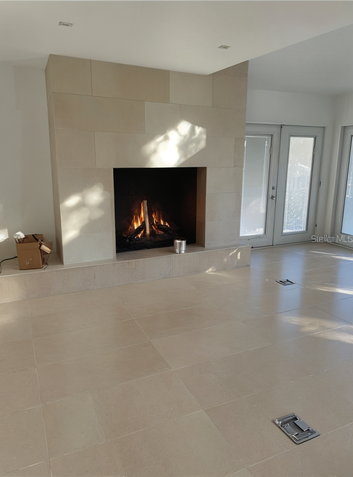 add beige curtains only on right of fireplace turn on recess lights add modern furniture and light beige rug