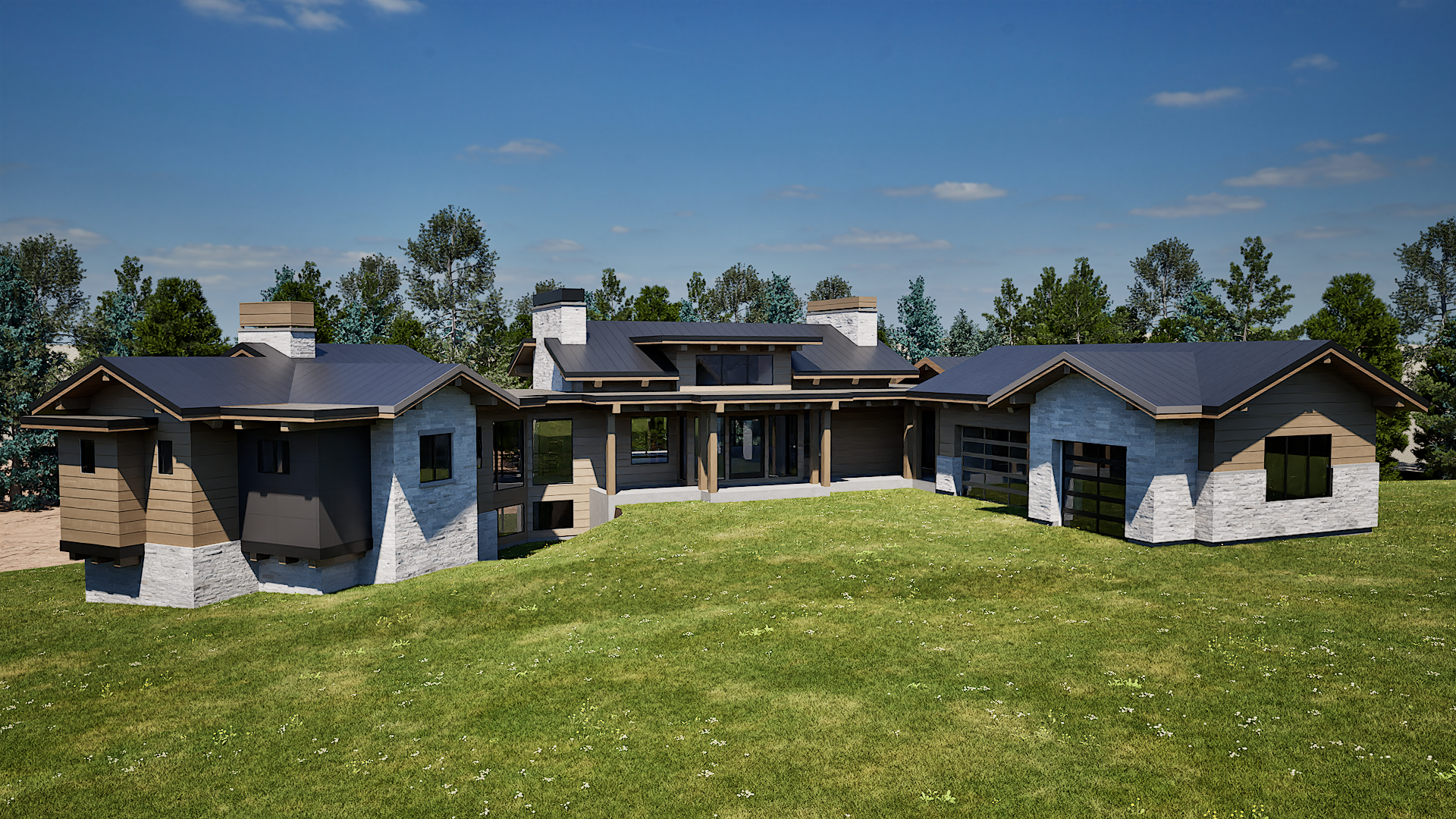 don t change the structure i want the environment to be a cool sunny day with a few clouds i want more vegetation in the background and more landscaping around the exterior of the house add lights illuminating from the windows make the exterior materials feel more realistic and natural