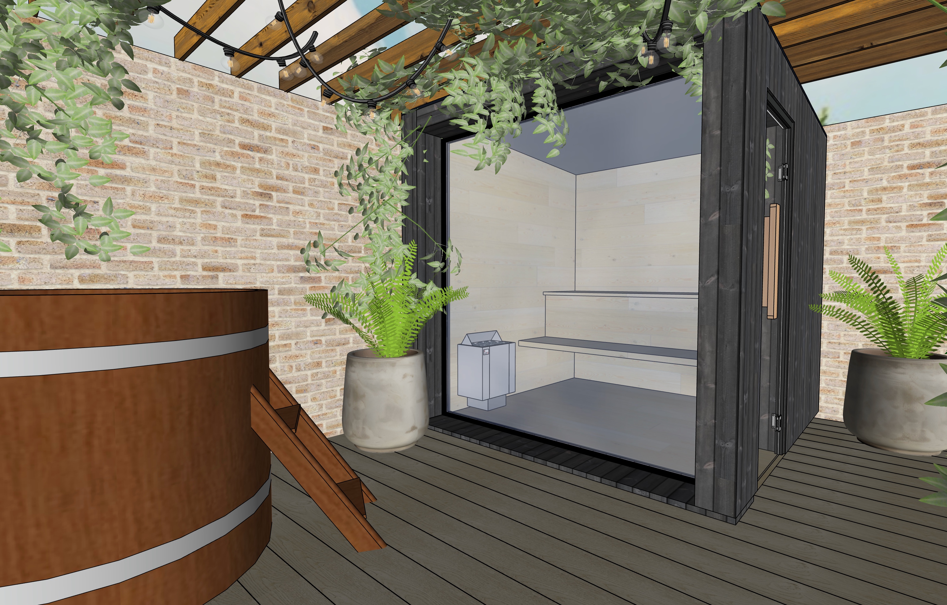 serine and calm outdoor sauna and plunge pool in natural afternoon sunshine
