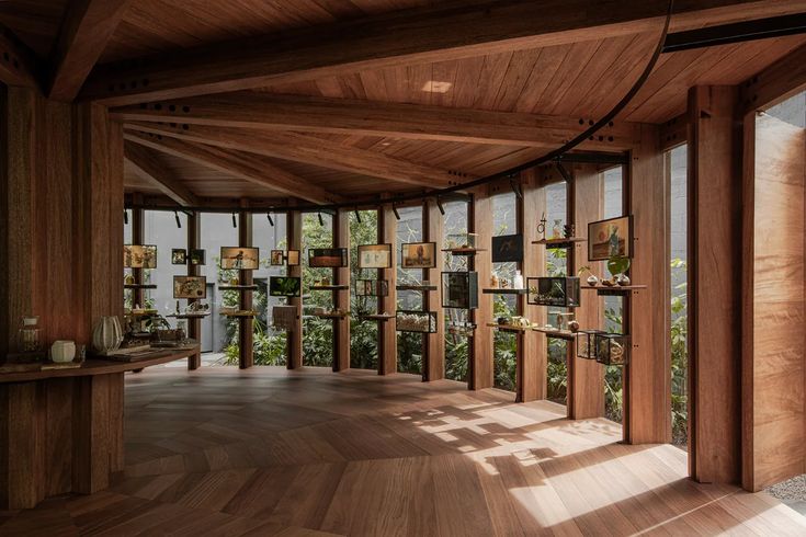 sarineen interior shot make it look like a rendered design nature wooden earthy colour and design with flowy curved lines architecture