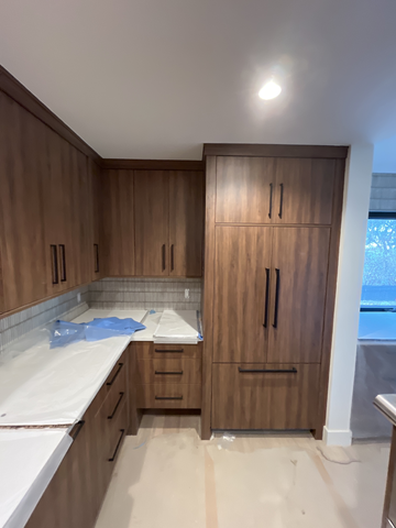 do not change the cabinets in any way preserve the exact cabinet colors materials finishes dimensions door and drawer styles hardware spacing alignment and all geometry exactly as shown do not alter the countertop shape backsplash appliances flooring lighting fixtures or wall structure only remove the construction materials clutter and mess from the scene clean the room and make it look finished and staged add a few simple tasteful home accessories appropriate for the style of the space but do not add or remove any furniture windows or architectural elements maintain the original lighting direction and realism enhance clarity and polish the photo while keeping the cabinetry and room design completely unchanged do not alter the lighting to keep the cabinet colors as they are in the image add a simple view out the window add flooring stage the countertop for a minimalistic kitchen