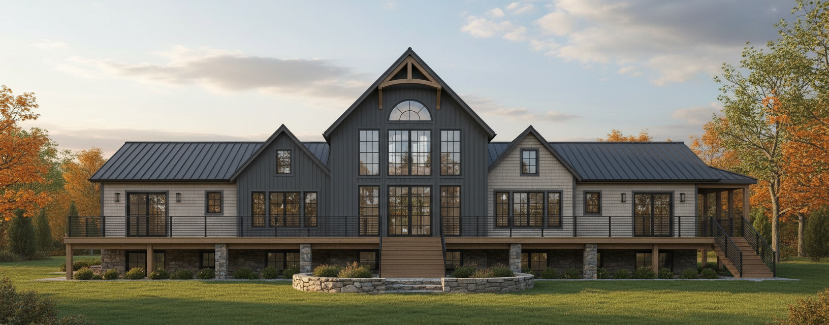 do not change the materials of the building and do not change the design of the building enhance the stone material and enhance the charcoal grey corrugated metal panels do not change the parking and road do not change the curb design this is a commercial building add hyperrealist grass in the green areas show warm sunlight from behind the building but do not change the color of the building add a light sky