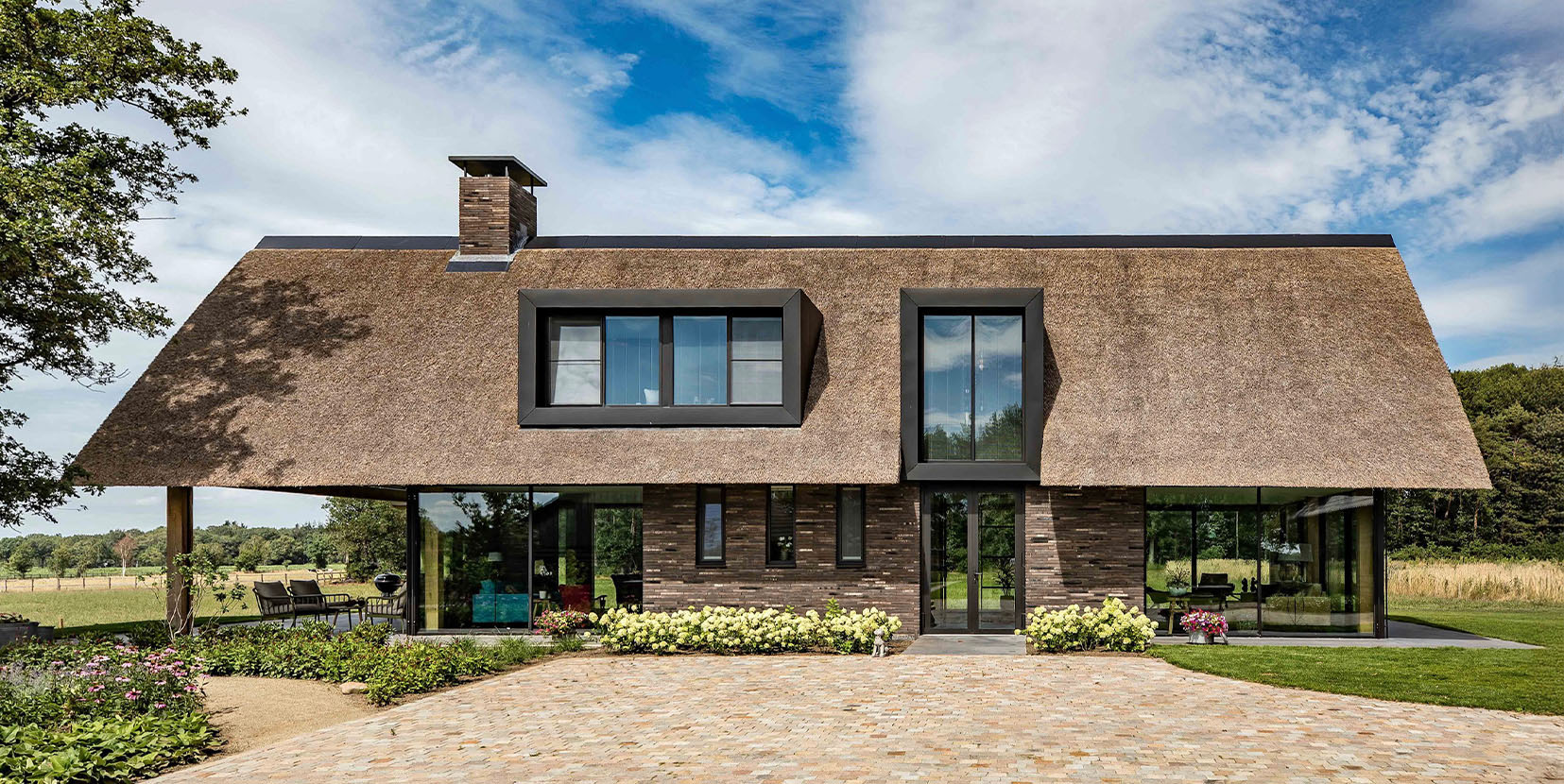 exterior shot render a modern house with sleek black wooden exterior walls and large reflective glass windows the roof is a light beige blending with a chimney in matching gray tones surround the house with vibrant green trees under a clear blue sky casting soft shadows the atmosphere is serene and inviting full of natural light and warmth