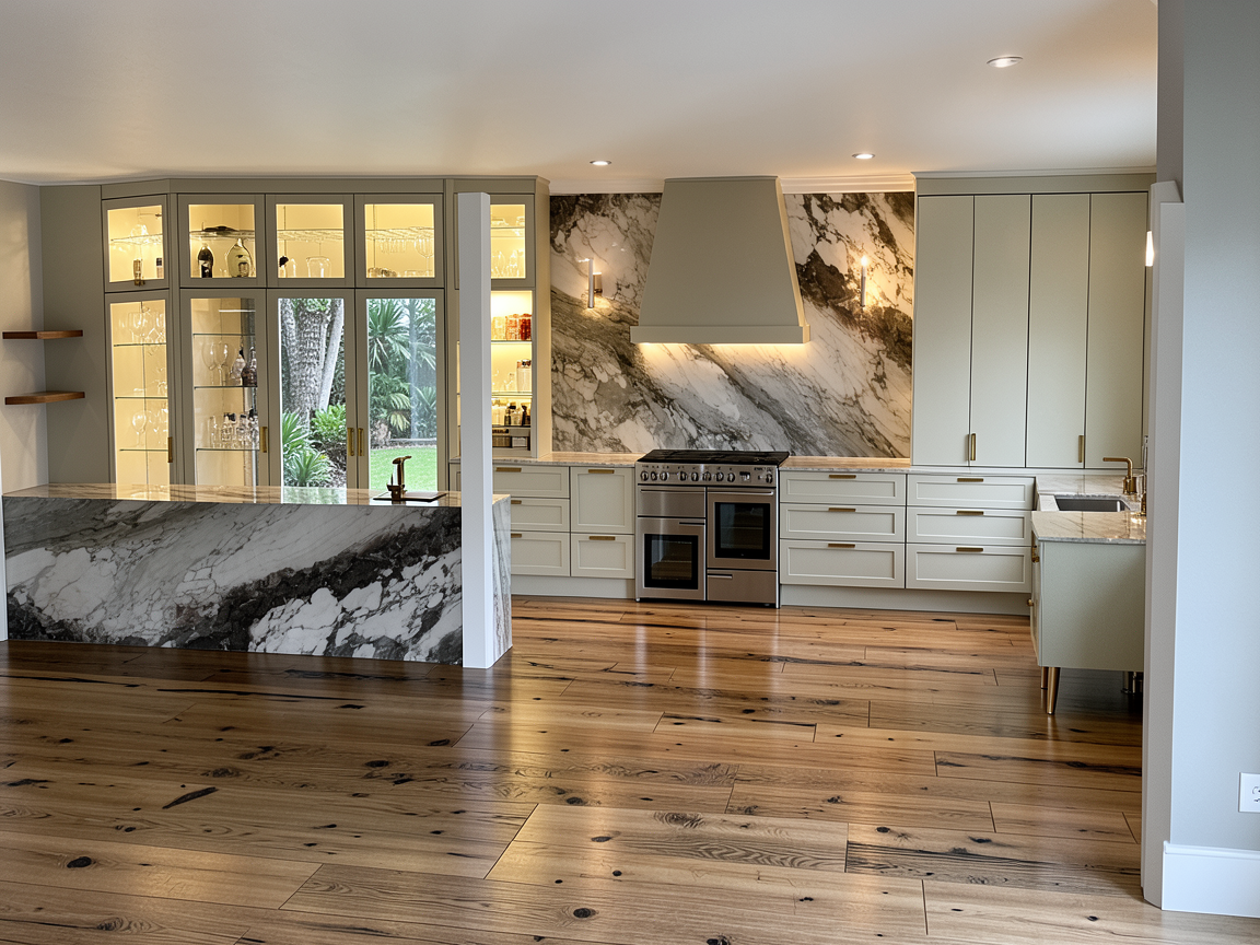 panels are decotec cashmere gold matt 384 and between them are 2700k strip lights as well add ambient light from the ceilings potlights shown