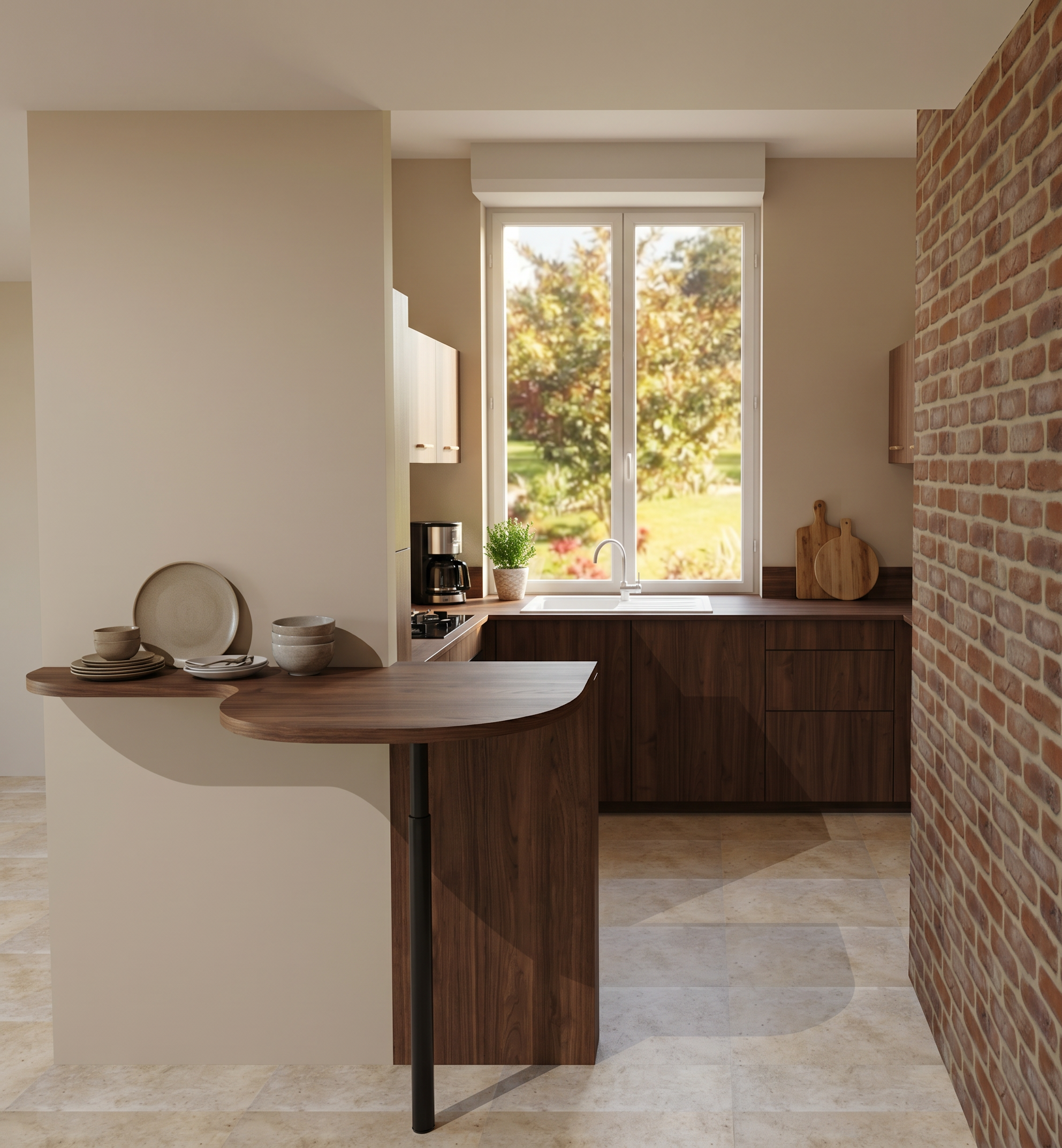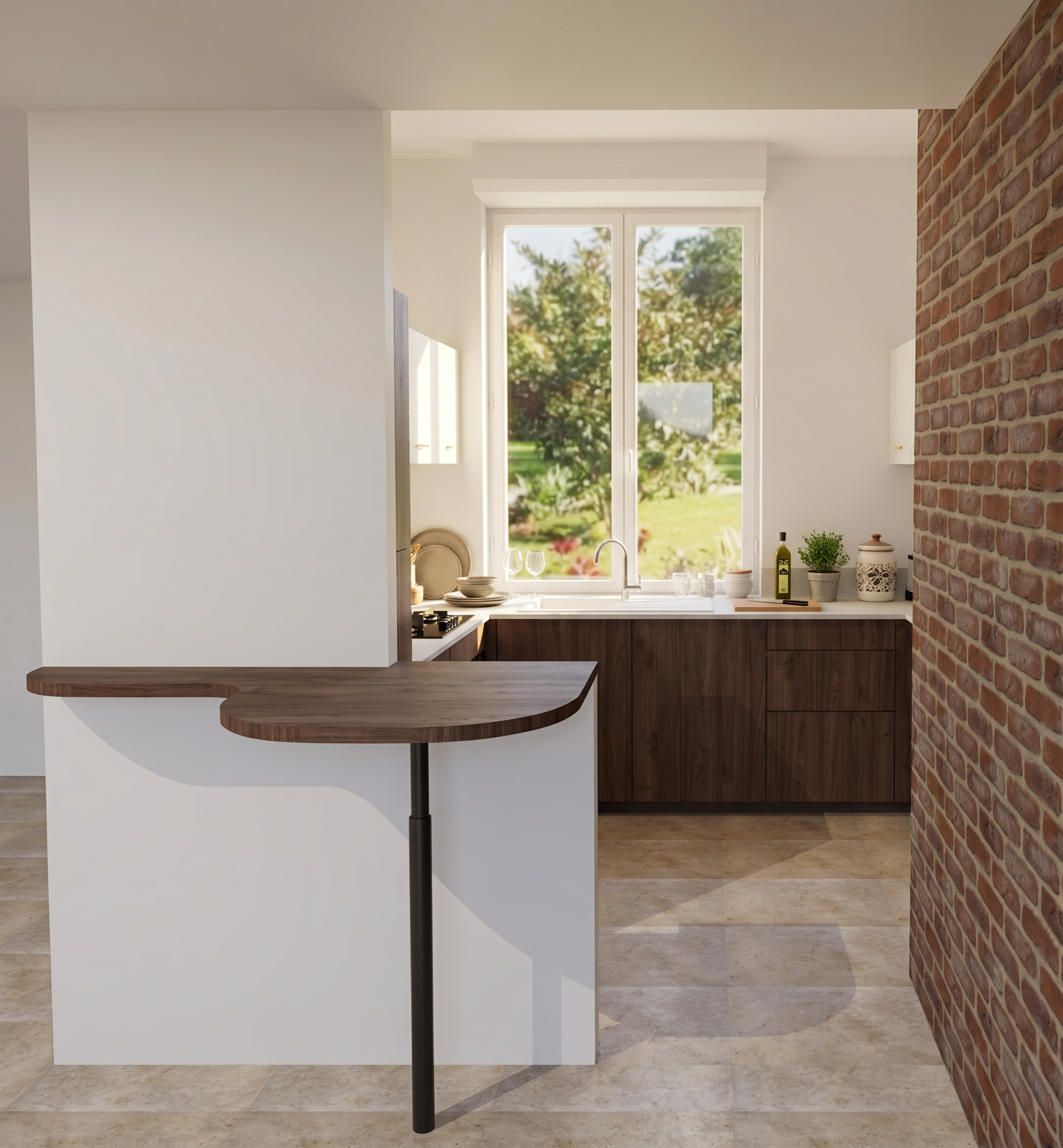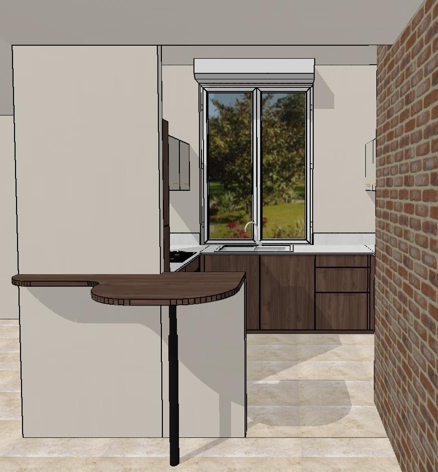 ajoute de la d coration et de la vaisselle sur le plan de travail conserve les couleurs de meubles de l image robinet inox et vier blanc ajoute un tabouret et de la d co sur l ilot et un tableau sur le mur au dessus
