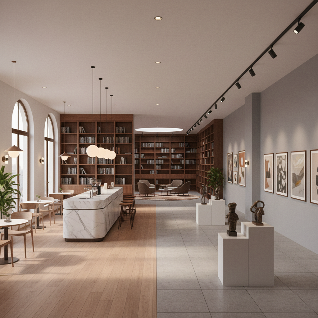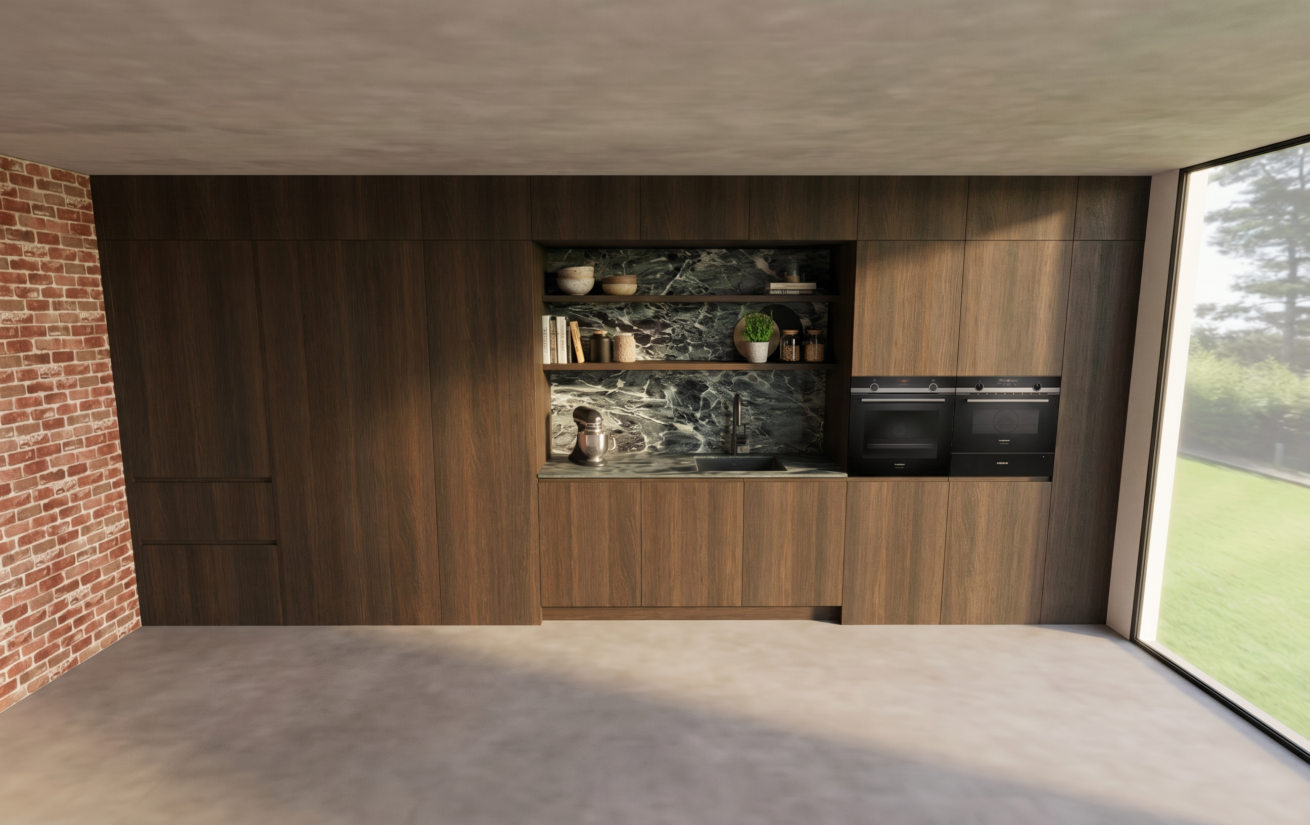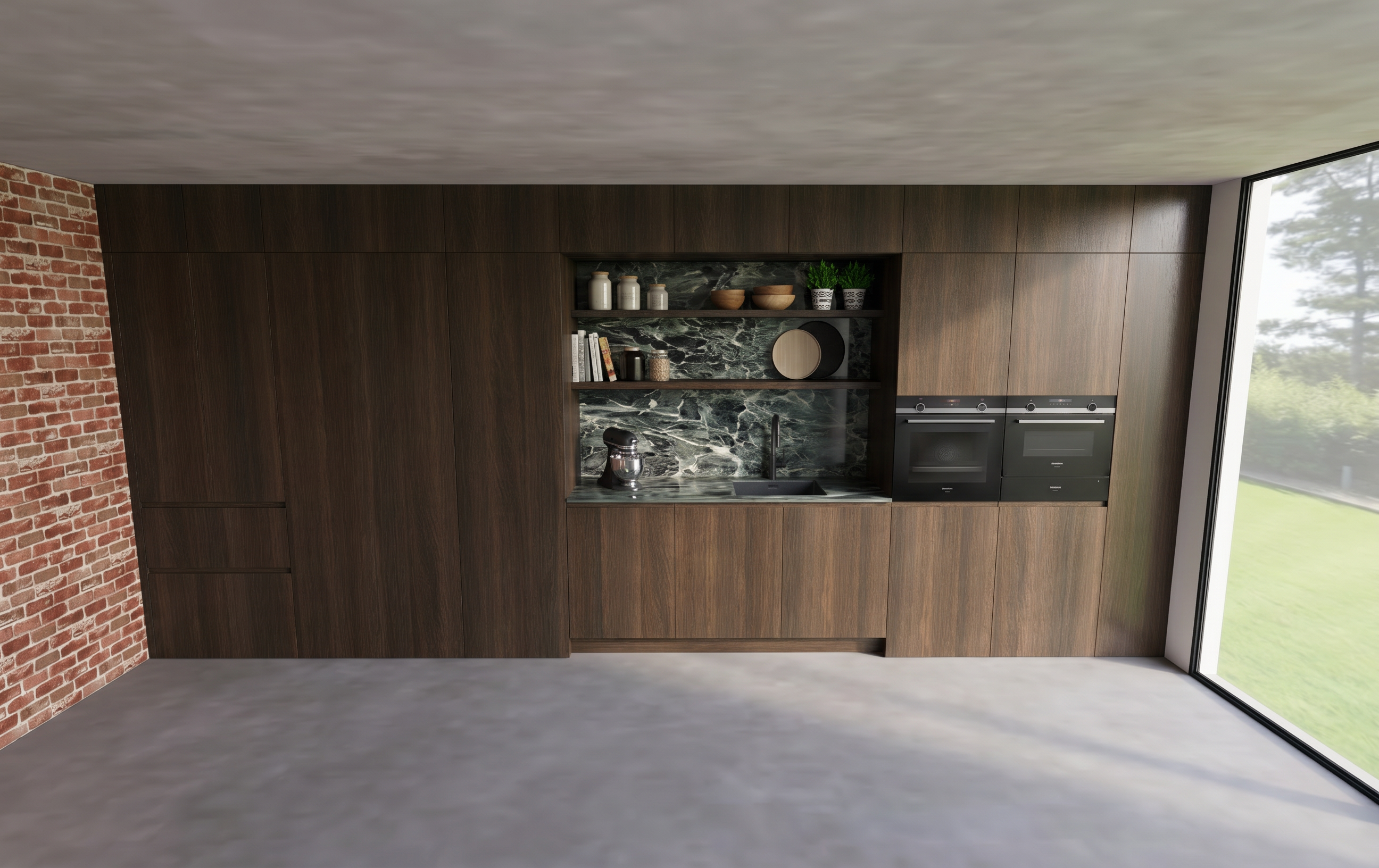 ajoute de la d coration et de la vaisselle sur le plan de travail conserve les couleurs de meubles de l image robinet inox et vier blanc ajoute un tabouret et de la d co sur l ilot et un tableau sur le mur au dessus