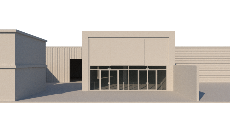 modernist exterior shot keep original geometry modern hardware store facade ferreter a moderna based on a simple sketchup massing model clean contemporary commercial architecture with strong and trustworthy color palette dominant deep blue tones combined with accents in red or orange for signage and branding large glass storefront windows at the front showing interior activity and product displays clear main entrance with modern metal framing the warehouse area visible towards the back expressed with industrial corrugated metal sheets l mina galvanizada slightly set back from the main facade use modern materials glass painted concrete steel aluminum and metal panels professional solid and reliable appearance daytime lighting realistic shadows clean surroundings realistic scale architectural visualization high detail sharp edges modern mexican commercial context architecture