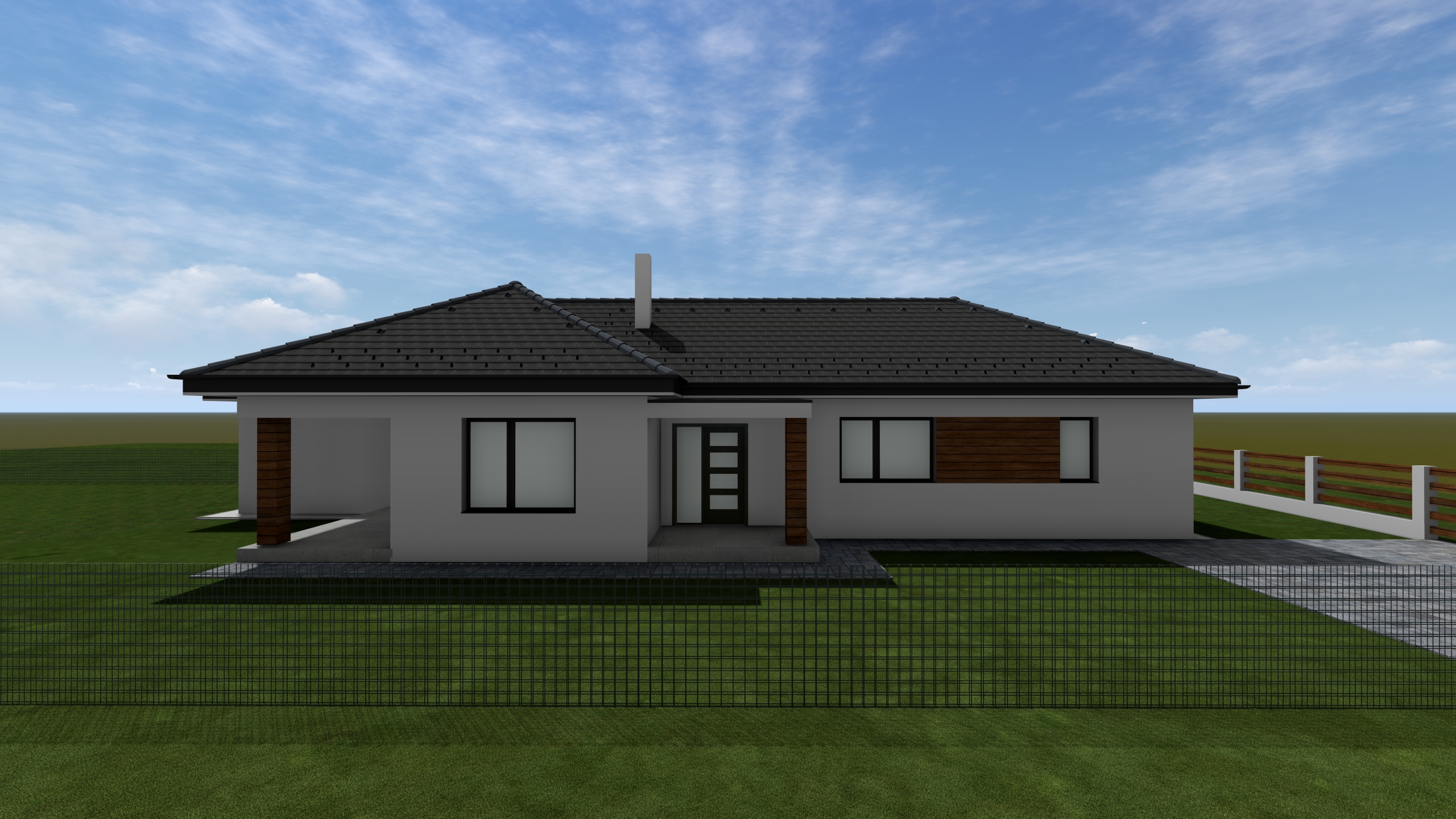 render a photorealistic 3d perspective of this house in a hungary hyper realistic 8k cinematic lighting serene atmosphere photorealistic textures keep model geometry the same windows doors roof walls pavement driveway fence reference the current material style just enhance them do not change the view only enhance the current materials and make the landscape nicer vegetation detailed textures in the wood siding and glass reflections and a vibrant clear sky with light atmospheric depth render in hyper realistic architectural visualization quality 8k resolution roof minimalist anthracite concrete tile facade a mix of smooth white mineral plaster horizontal walnut wood slats windows antracit aluminium minimal fence anthracite colored premium metal mesh landscape professional minimalist garden design green clean cut grass