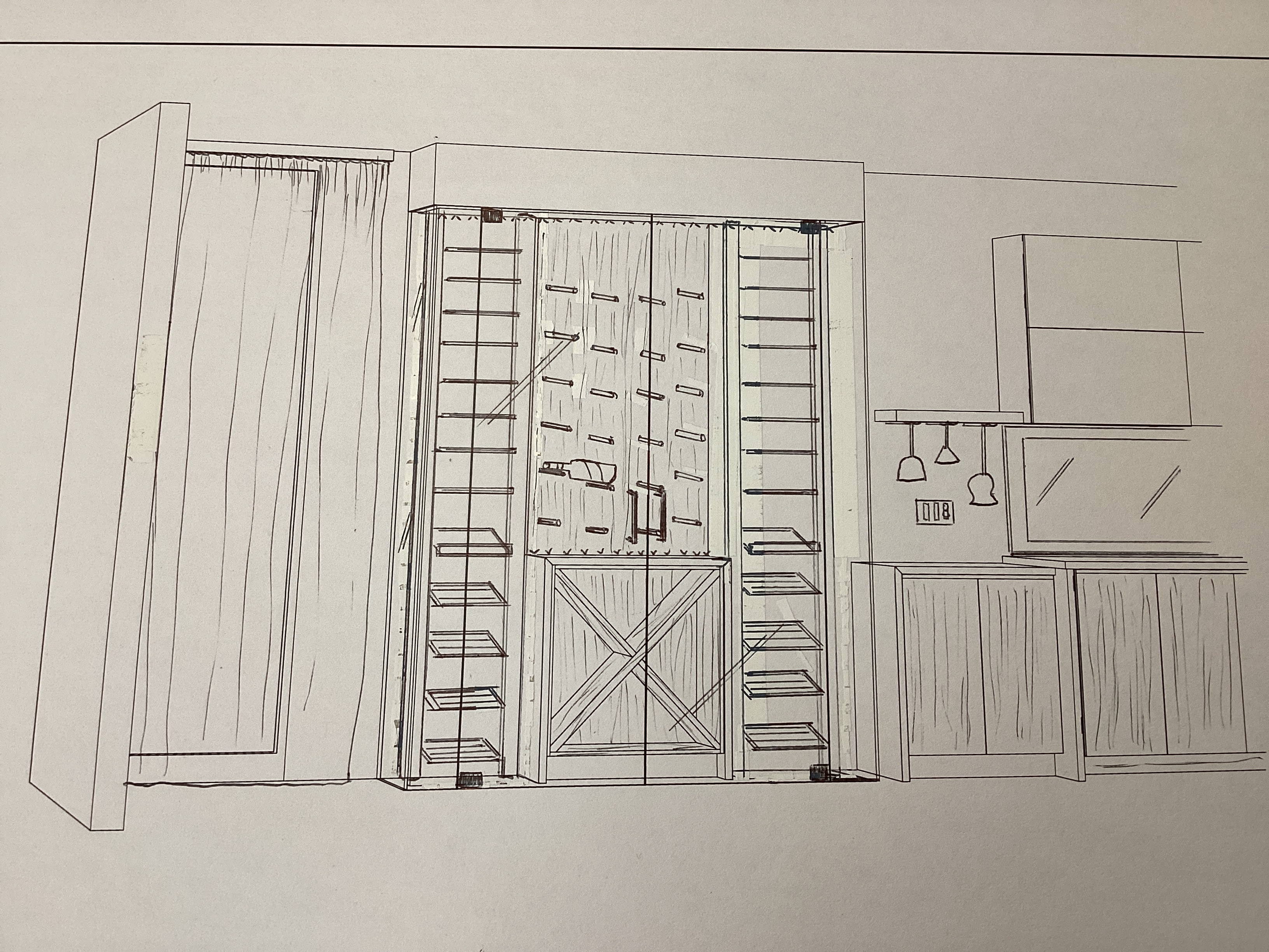 could you please put the white translucent curtain on the left then the two shelves on either side of the black x shaped module the central x shaped module is natural maple surrounded by a white quartz u shaped countertop with a subtle gold veining above this x shaped module is a natural maple panel with small black rods incorporated into it the entire unit is enclosed by glass panels with two black handles and a white box at the top to the right of this large glass block are two natural maple colored modules each with an l shaped quartz countertop the quartz countertops are white with a subtle gold veining above the last module on the right there is a window with a black border below the top module which will be white and to the left of this top module there is a white shelf holding clear glass wine glasses