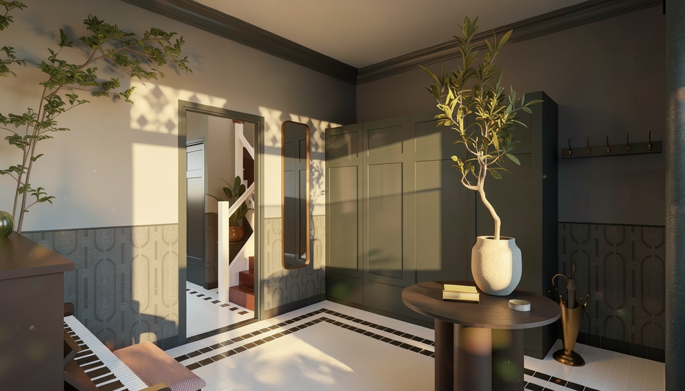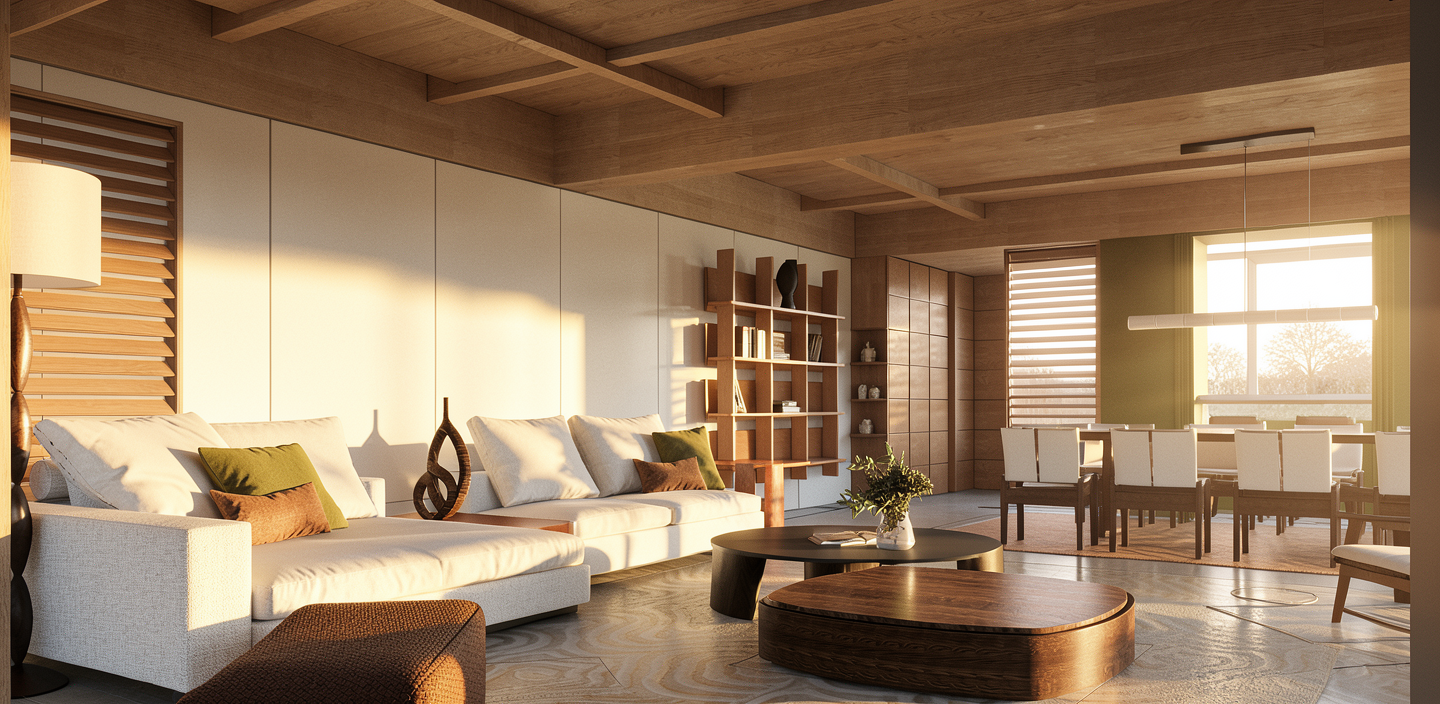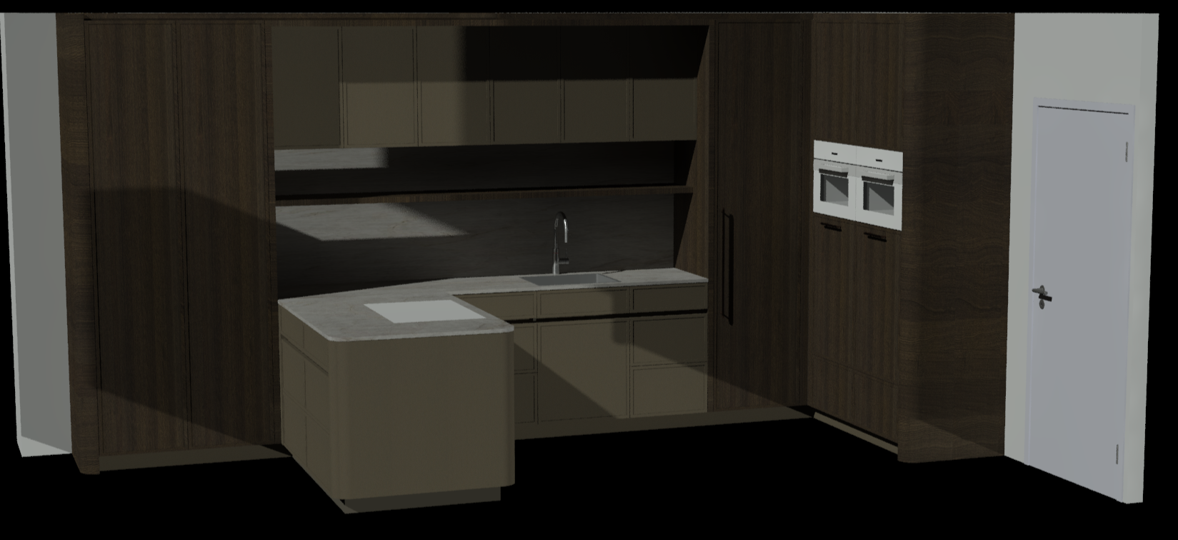 create a high quality photorealistic render of a modern kitchen based on the provided imos ix model add a natural oak wooden plank floor with visible grain and realistic texture horizontal laid in a linear pattern the ceiling should be clean white with evenly distributed recessed spotlights providing soft warm illumination in the niche srompt helving integrate led lighting within the wooden plank that emits light both upwards and downwards creating a subtle ambient glow and highlighting the niche area not in the top only the shelf style the kitchen with realistic accessories to bring the space to life include items such as cutting boards a coffee machine kitchen utensils glassware plants and small decorative elements ensure the styling feels natural and lived in not staged use soft natural daylight combined with the artificial lighting to create a balanced inviting atmosphere emphasize realistic materials reflections and shadows for a premium lifelike result leaf the collers materiaals as it is