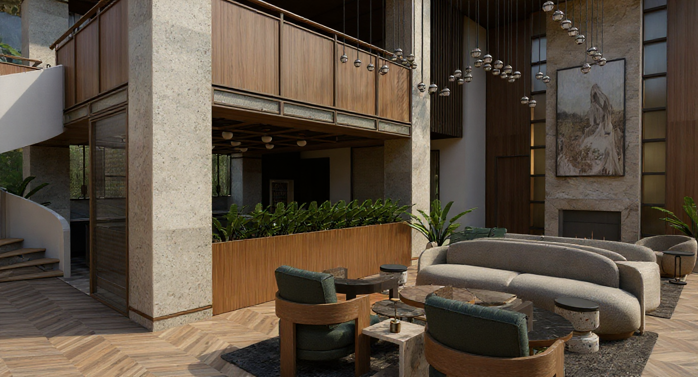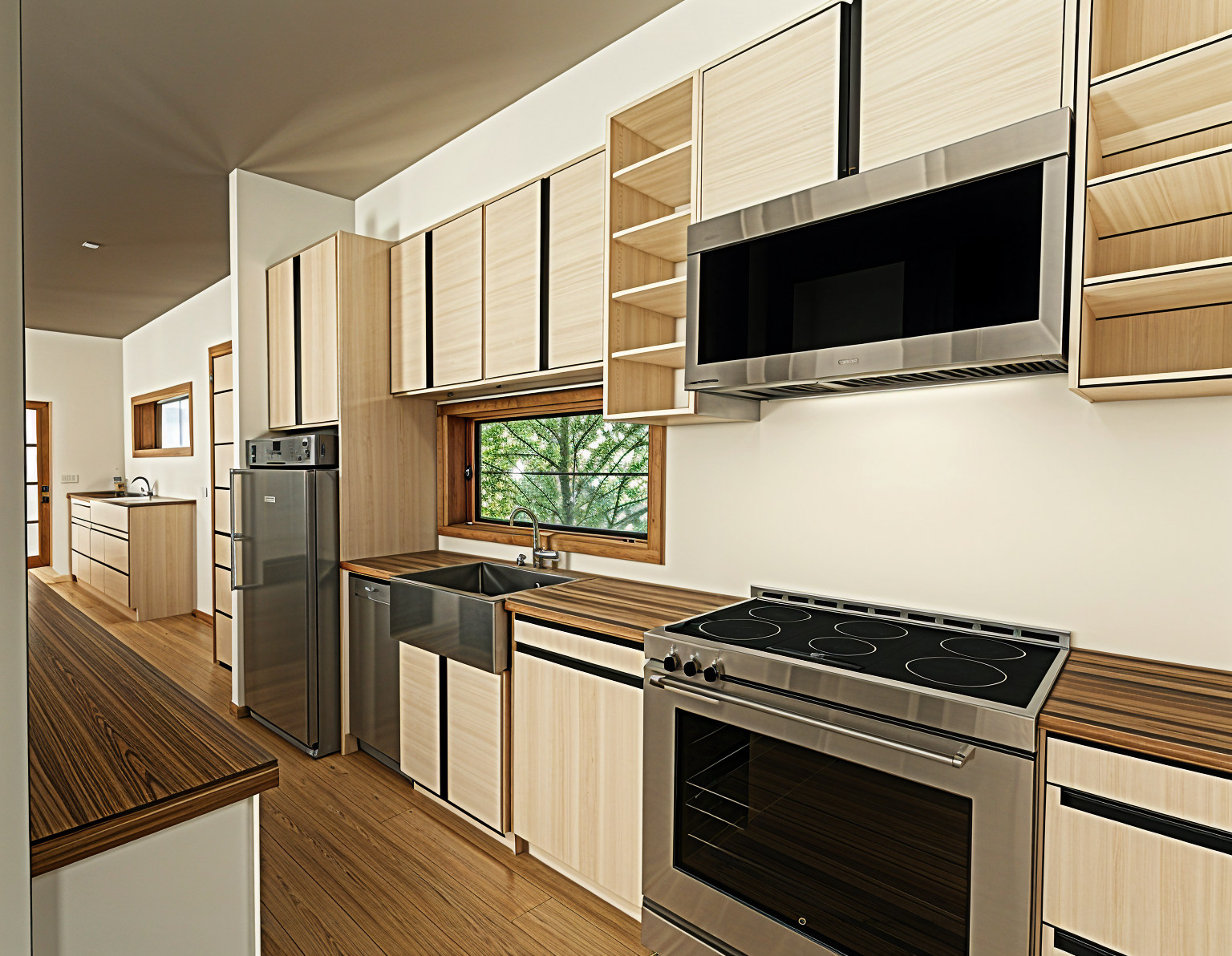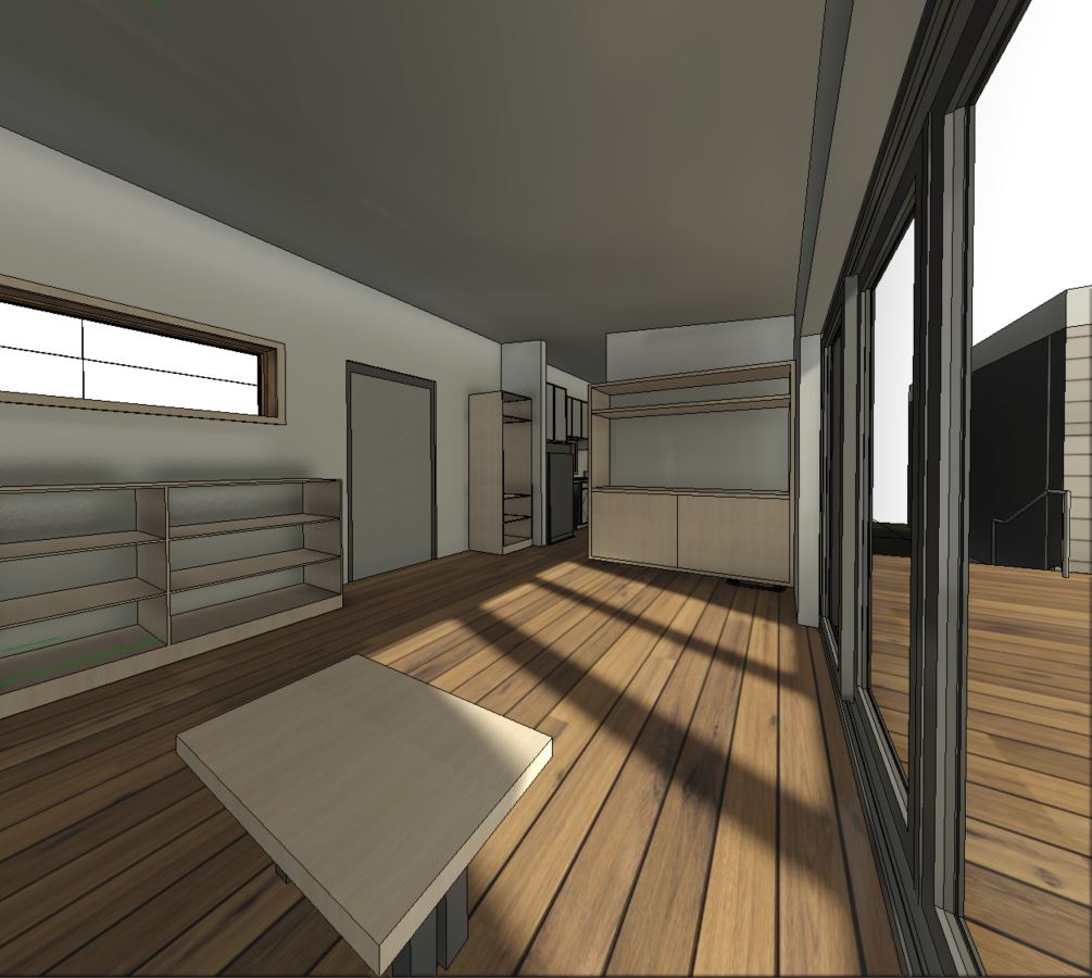 a realistic interior perspective shot of a living room with light colored casework nice hardwood floors a grey wood front door with a window and a porch outside