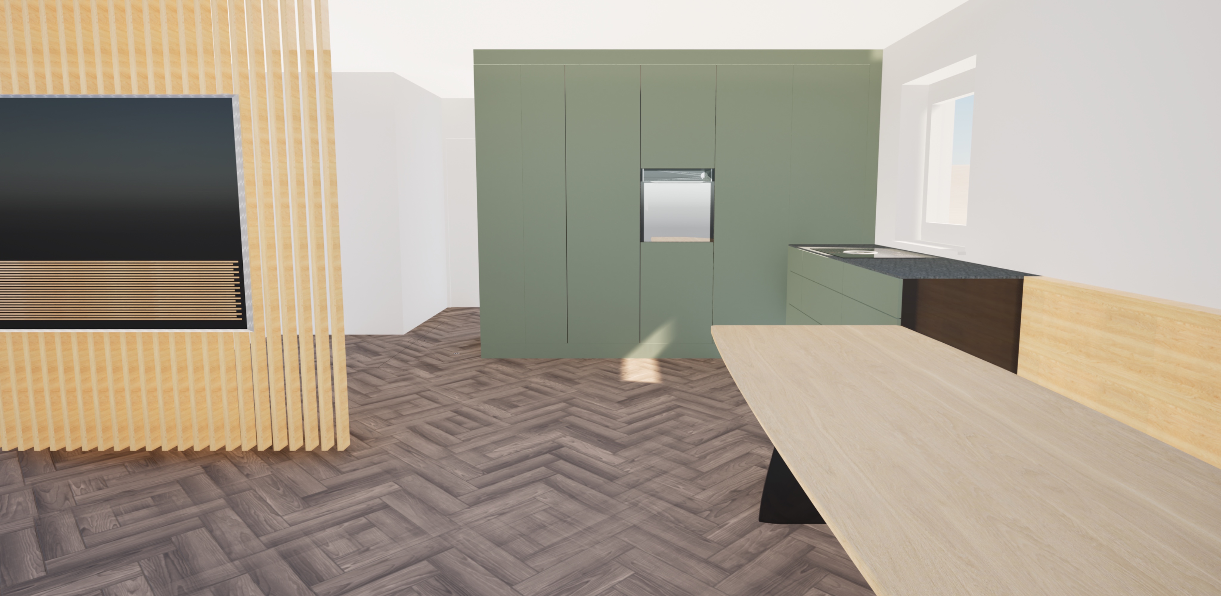 put an oven with black glass in the middle of the kitchen change the tv to an 55 inch tv change the color from the floor a little bit lighter and match all wooden parts
