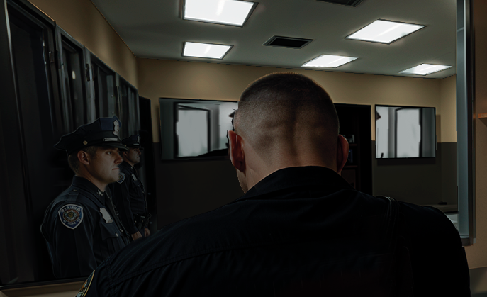 put some male police officers completely in profile and in the background improve the perspective of the windows towards the interior of another white room