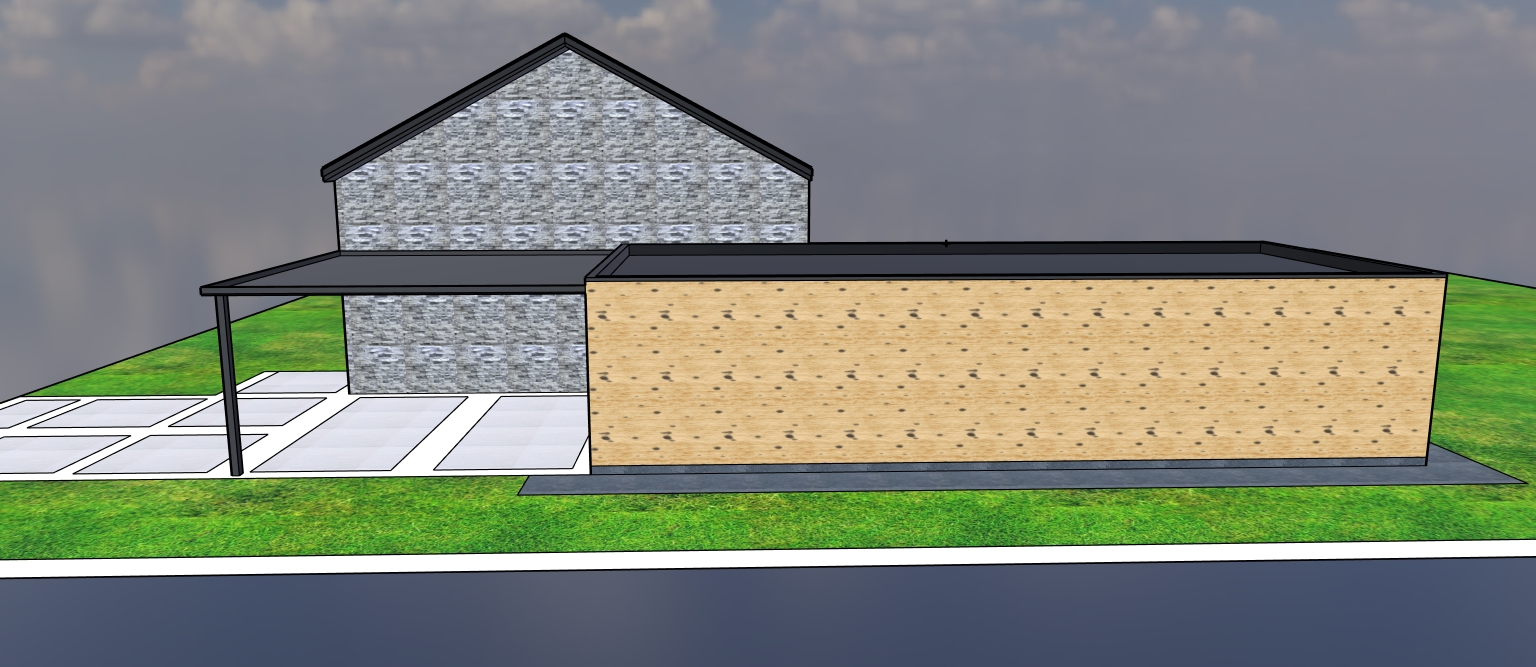 green woods low mountain soft grey stone wall a carport black golfed roof lawn around the house