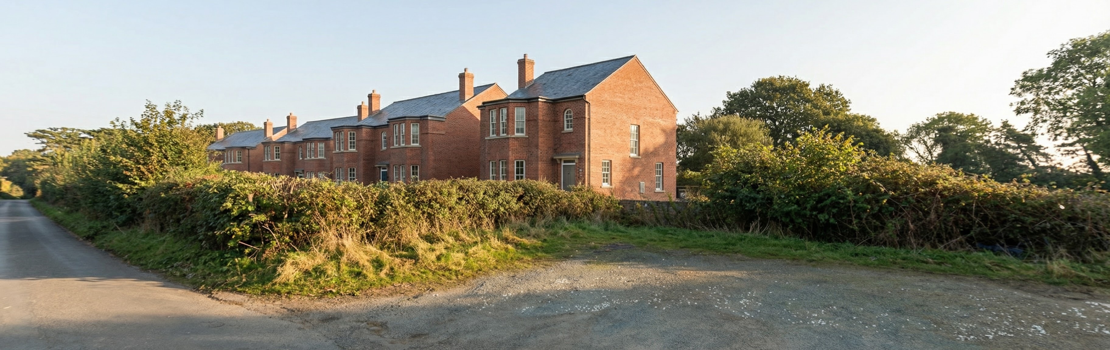 create a realistic render showing red brick georgian style houses nestled behind a hedgerow the two buildings in the middle should include a cream render
