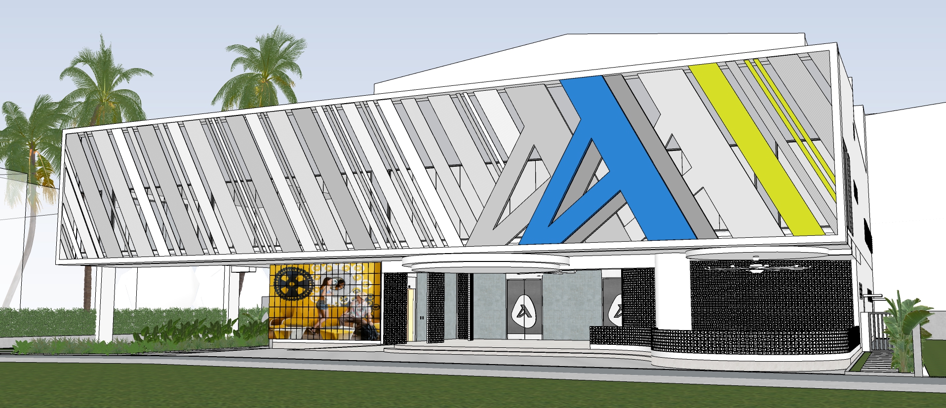 maintain the colors shown in the reference perspective just change the gray color of the curved prforated wall into white perforated wall