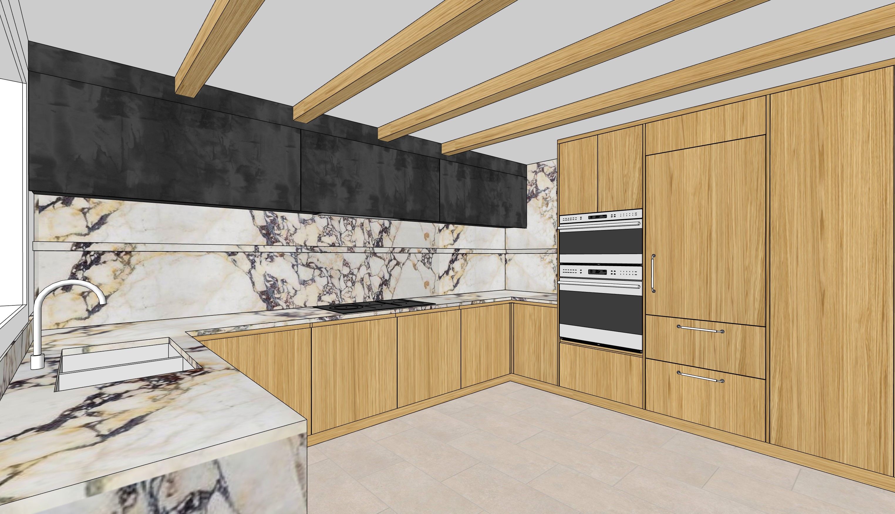 the dark gray cabinets are going to be patina iron color metal cabinet fronts but make sure that the patina is still gray make the color almost like a dark gray color with a little bit of gloss to it while the wood cabinetry are going to be in rift cut natural oak cabinets