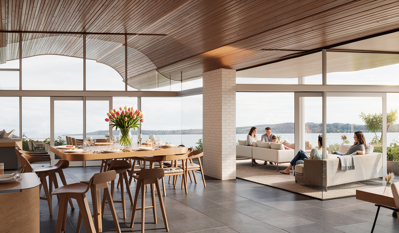 render the scene on a beautiful spring day the materials and colors must be maintained the facades in smooth plaster the windows as white plastic windows the balcony railings in galvanized dark steel the balcony partition walls made of wood depict the lawn realistically add a few people to the image the entire image in realistic and lively light