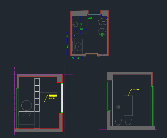 exterior shot create two 3d renderings of a 4m2 bathroom with an almost square shape including the materials from the moodboard