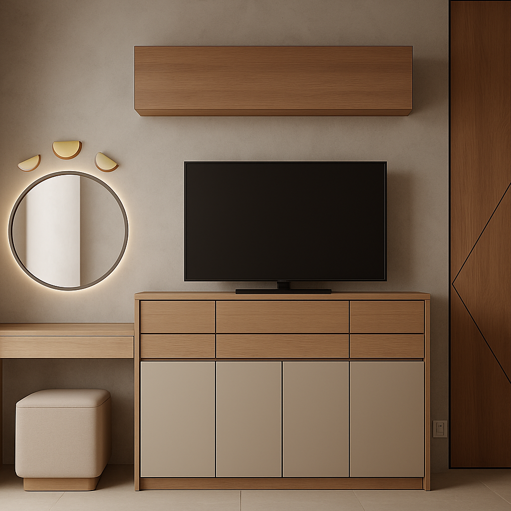 interior shot from elevation to 3d proposal make up desk and tv unit top shelf open for books