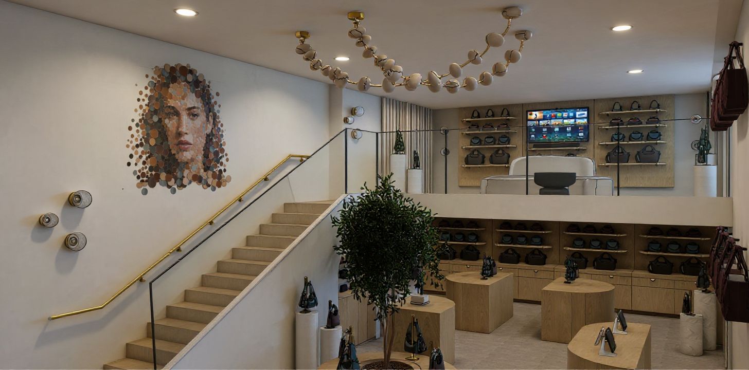 make photorealistic turn on sconces turn on chandelier add recessed lighting to the ceiling dont alter mural light under the mezzanine add recessed lighting dont alter the chandelier