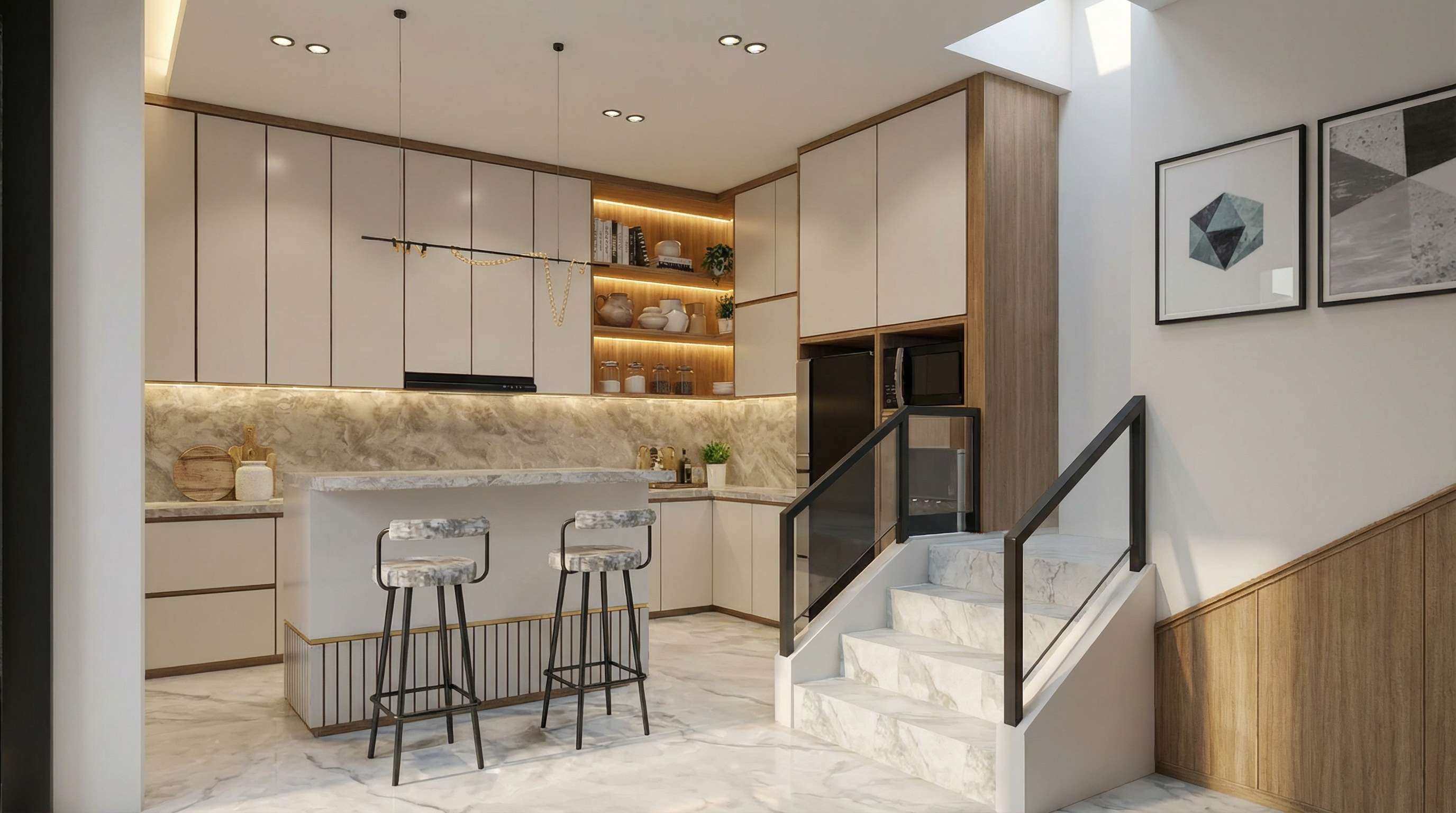 make ultra realistic image without changing any structures shapes design and materials do not change the jpeg size use soft glossy white marble texture for the floor add indirect light to every shelves do not change the materials