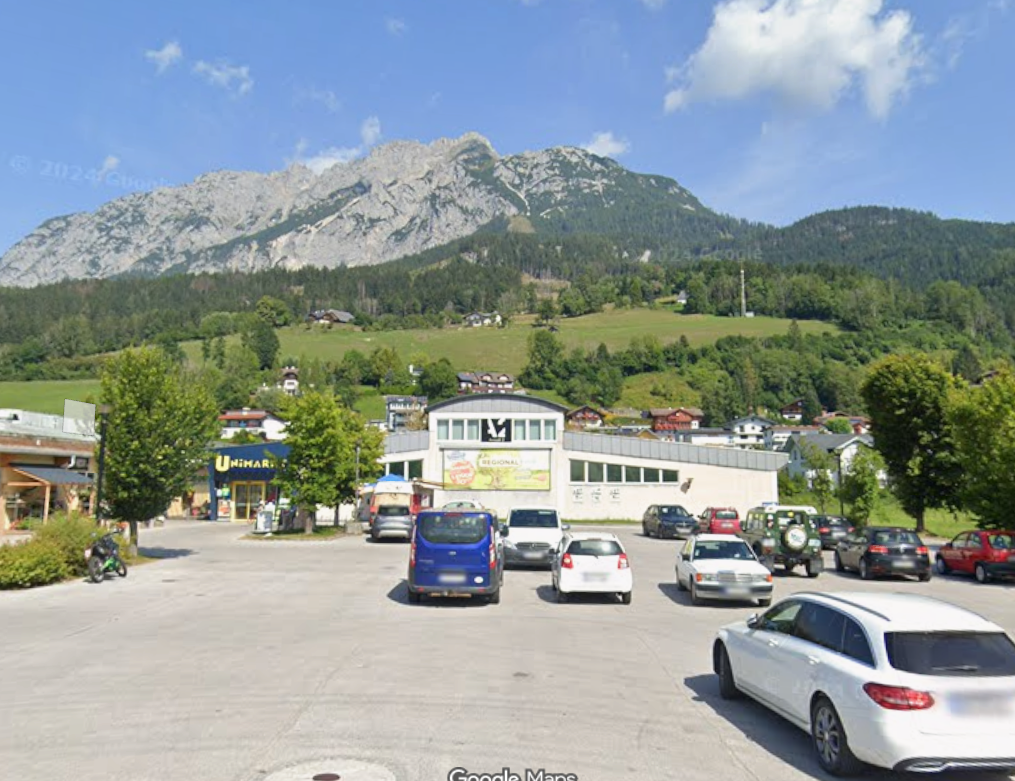 mache aus dem geb ude einen billa mit glasfronten vorne modern ca 3 meter vorne dazu als zubau eingang mittig die berge sollten bleiben die autos entfernen