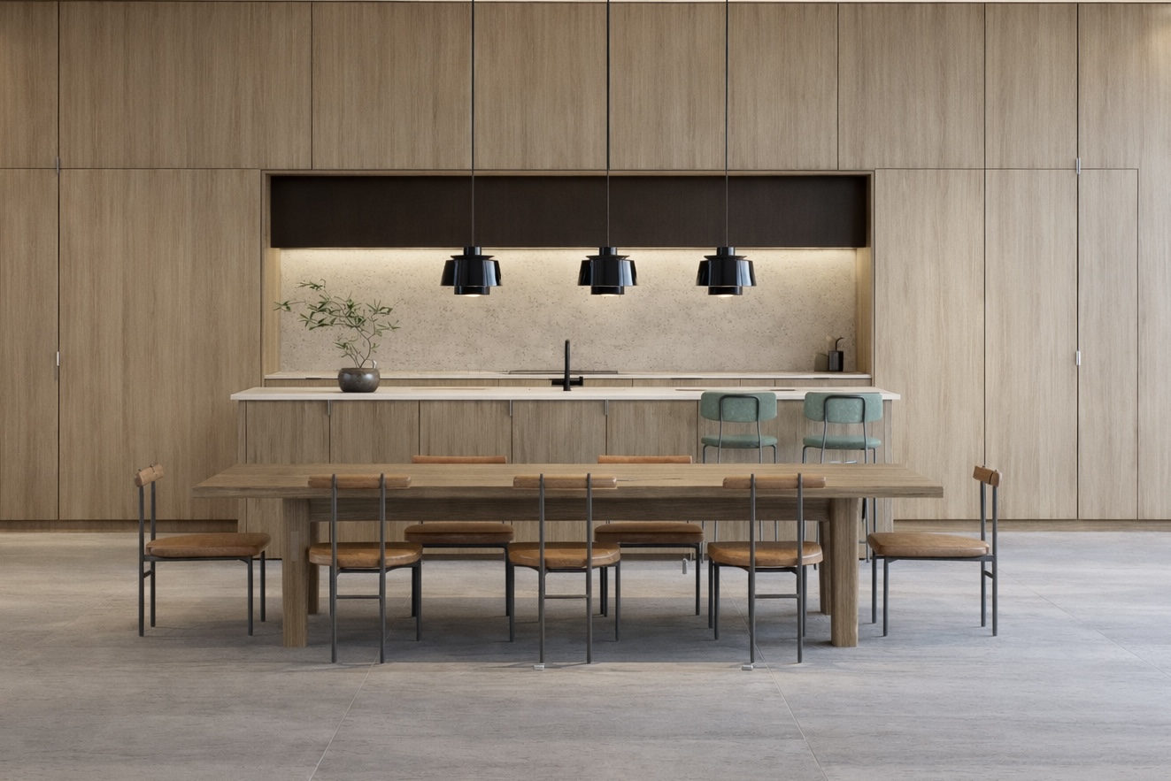 make this look more luxurious do not change architecture of layout floor is light gray natural stone furniture is white wood is clear hemlock lights are dark and made of walnut