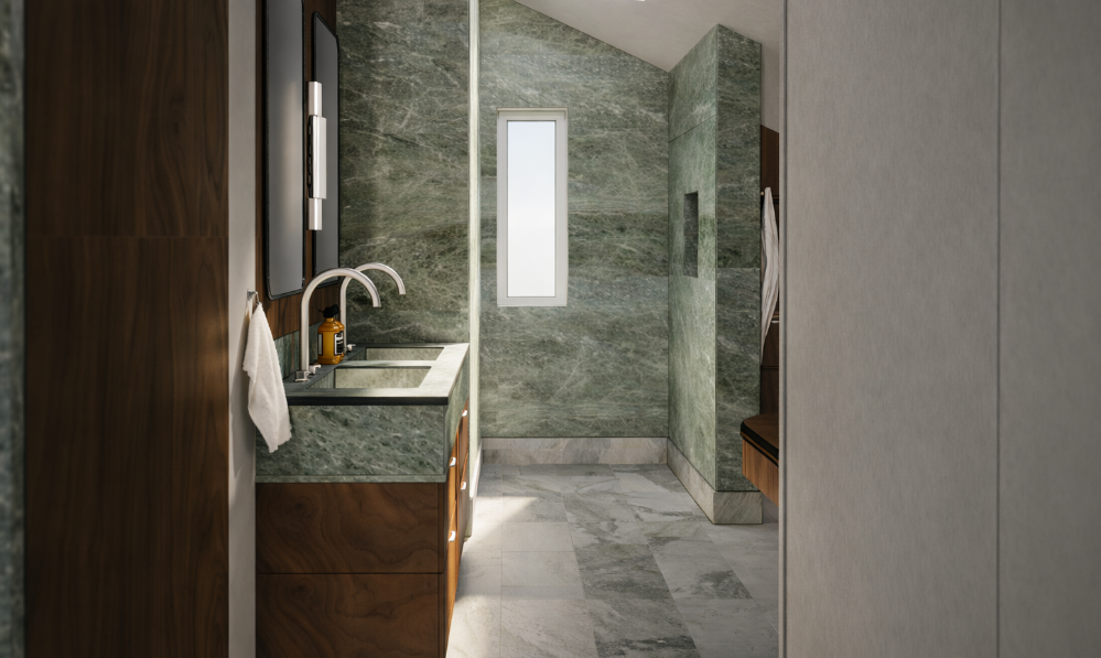 add a narrow fluted glass shower screen attached to the green stone the glass should go frm floor to ceilng