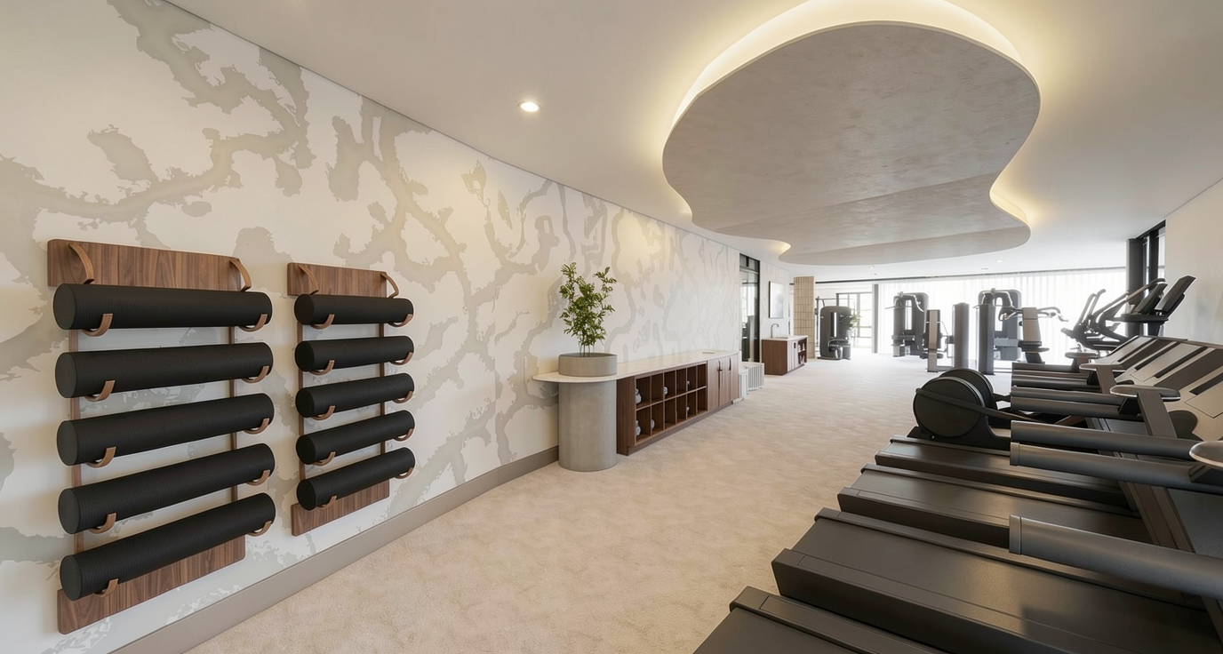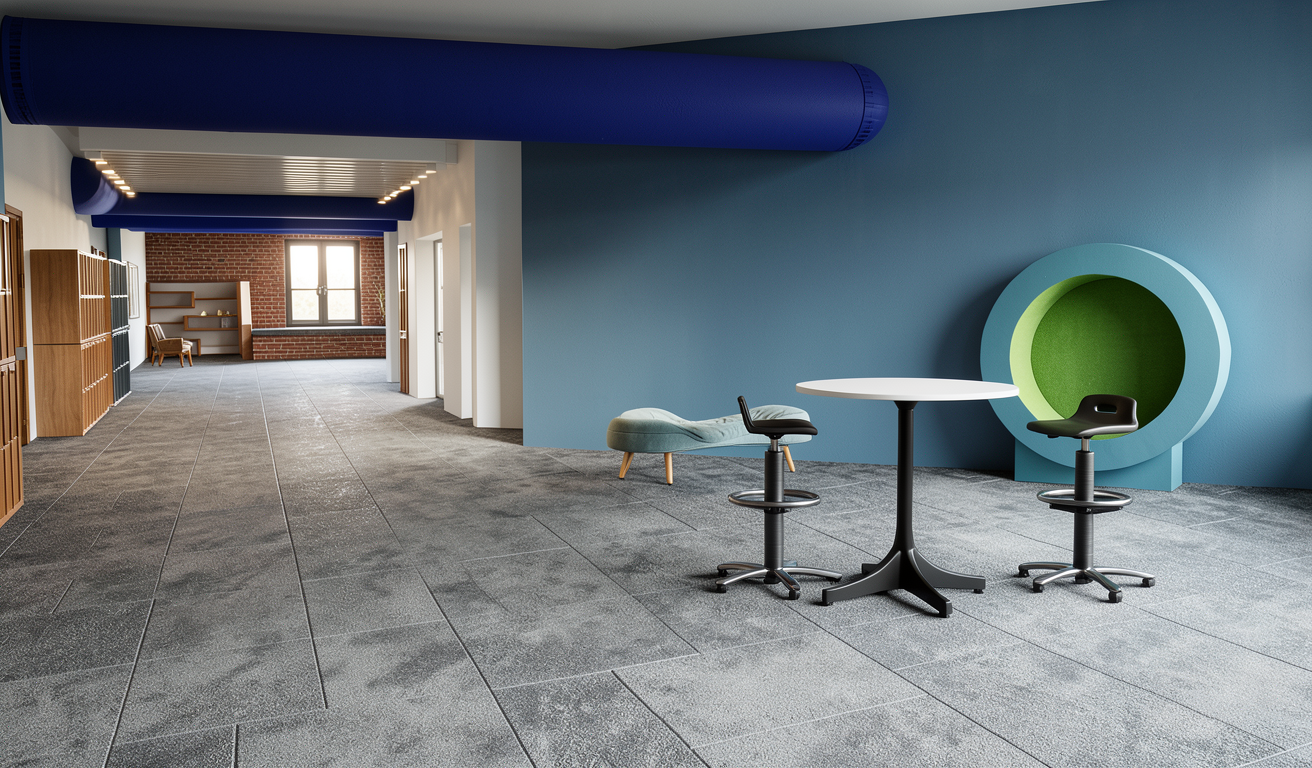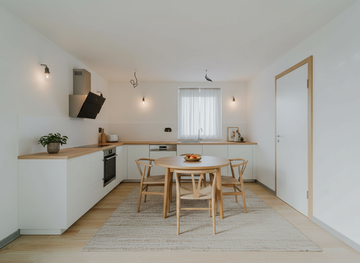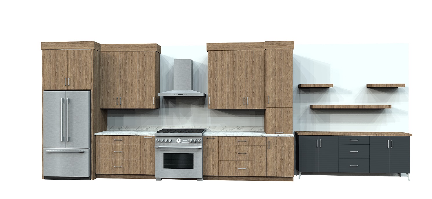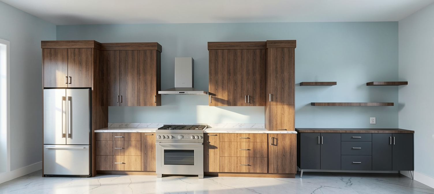 render a modern kitchen with a sleek minimalist design wooden cabinets in a rich walnut color with a natural grain texture the refrigerator stove and range hood are stainless steel reflecting a matte silver sheen countertops are a pristine white marble with subtle gray veining on the right dark graphite cabinets and shelves for contrast the wall is a soft pale blue creating a serene and airy atmosphere with natural light casting gentle shadows do not add a window on the left