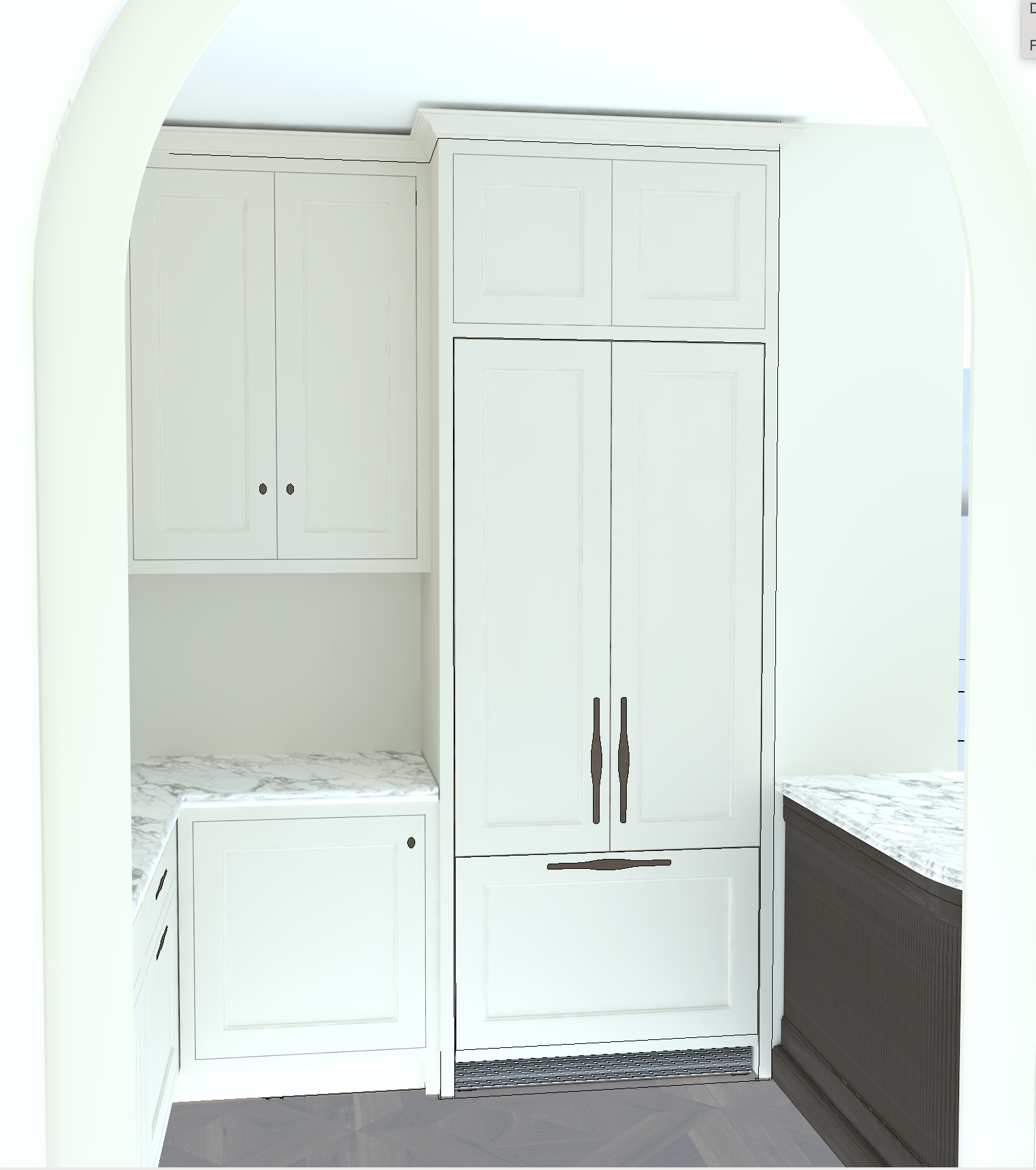 please add a window into the square opening behind the arch please add a glazed internal door sidelight to the right hand opening behind the island