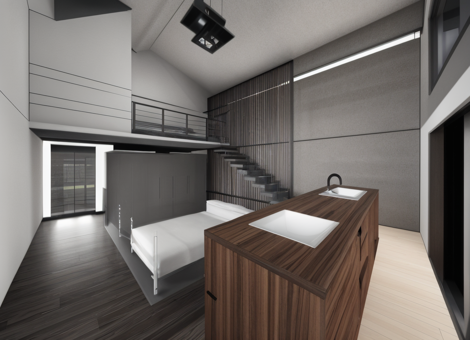 modern bedroom loft with a sleek minimalist design warm wooden slats as a divider on the left create a cozy atmosphere the golf simulator is deep with green turf flooring adding a touch of elegance soft white walls enhance the spaciousness complemented by a contrasting dark floor a rustic sliding barn door in warm wood tones offers a rustic touch accentuate with a modern light fixture above the golf simulator pit place a marble topped side table with white calla lilies in a black vase adding a pop of natural beauty the atmosphere is serene and sophisticated with soft ambient lighting completing the look architecture