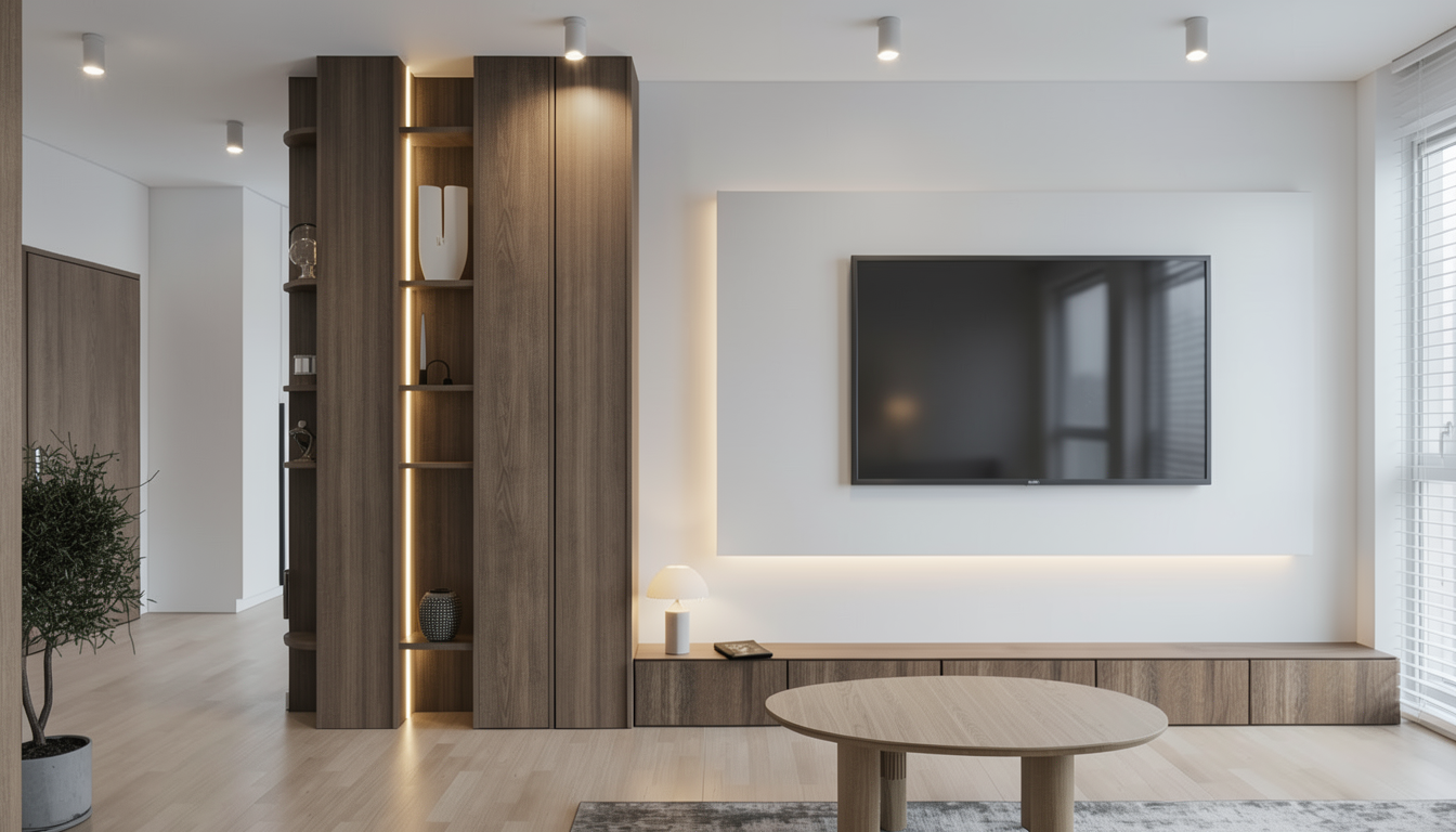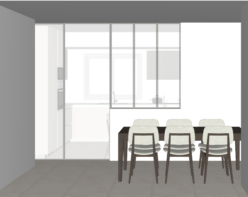 render a modern dining area with a minimalist design the dominant colors are soothing shades of gray for the walls and floor creating a calm and contemporary atmosphere feature a large dark wooden dining table with a rich brown color surrounded by four sleek chairs upholstered in a soft beige fabric highlight a bright and airy ambiance with glass panels separating the dining area from the kitchen which appears in crisp white tones ensure the lighting is soft and natural filling the space with a warm and welcoming glow