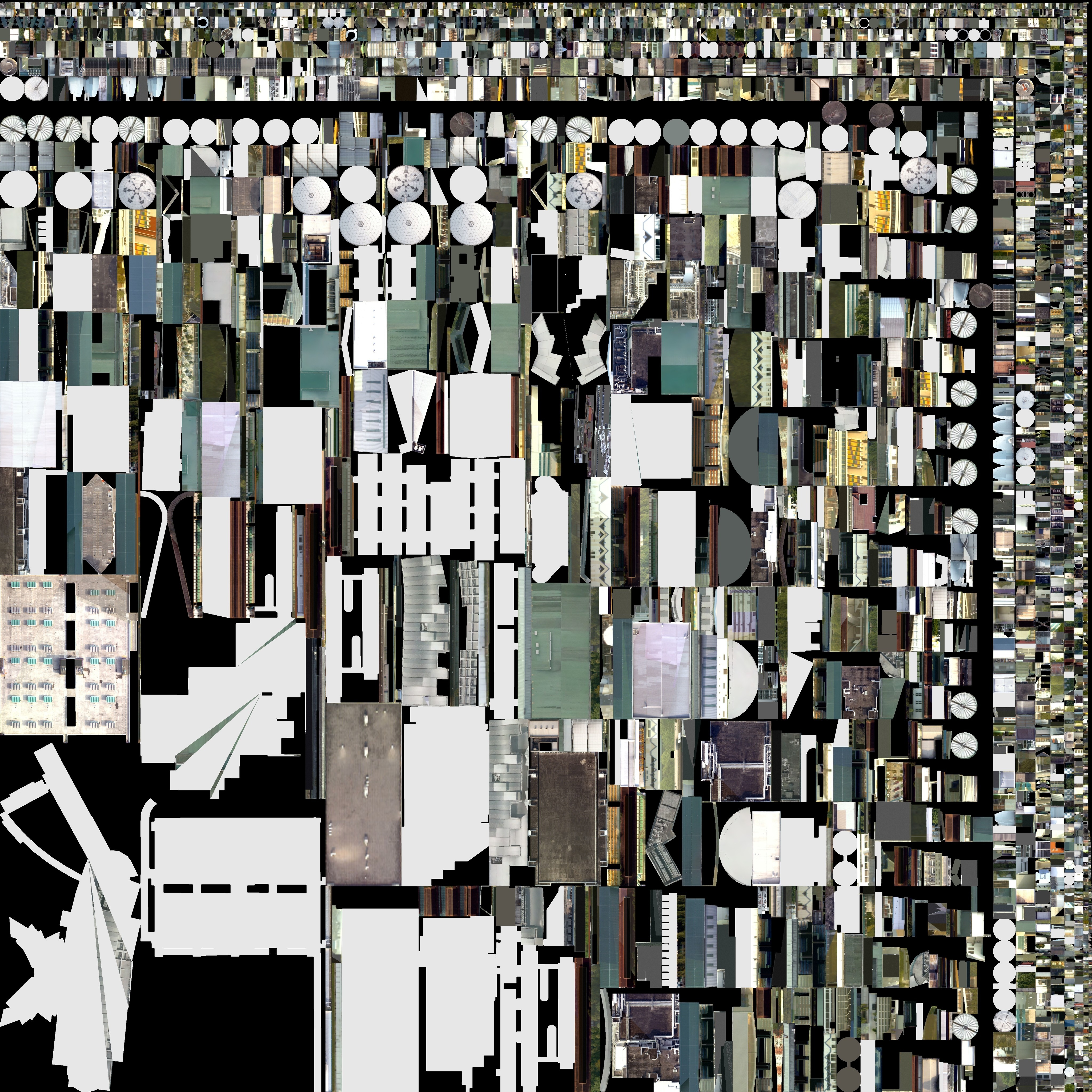 generative detail enhancement of a uv mapped texture atlas for a 3d building model preserve all uv islands exactly no movement no scaling no rotation no merging no change to island boundaries or layout enhance existing facade detail only especially areas that appear blurry or low clarity in the input recover sharpness and texture definition on building facades refine concrete plaster stone and glass surface detail increase micro contrast and material clarity without altering patterns maintain original colors tones and material identity across the entire atlas treat the image as a technical texture map not a photograph or concept art final result must look like the same texture captured at higher resolution and sharper focus fully compatible with existing uv mapping