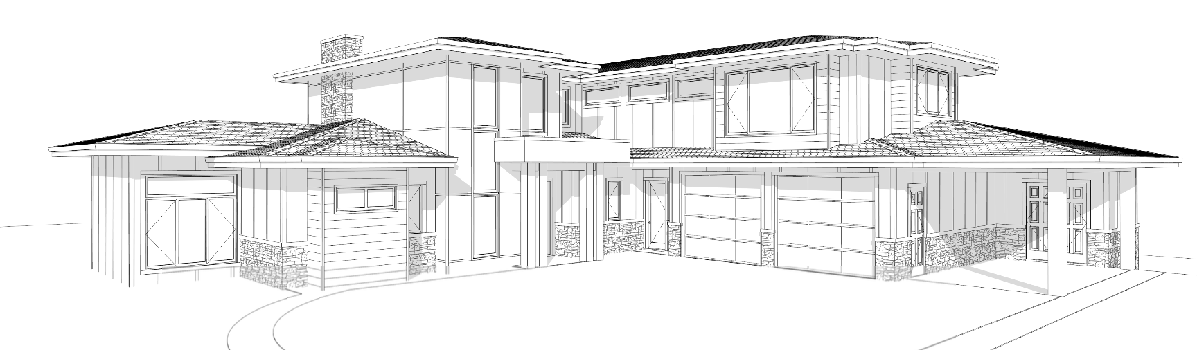 modern mountain home style with black shingle roof dark vertical siding light stone black windows and front door add some medium wood tone accents for warmth