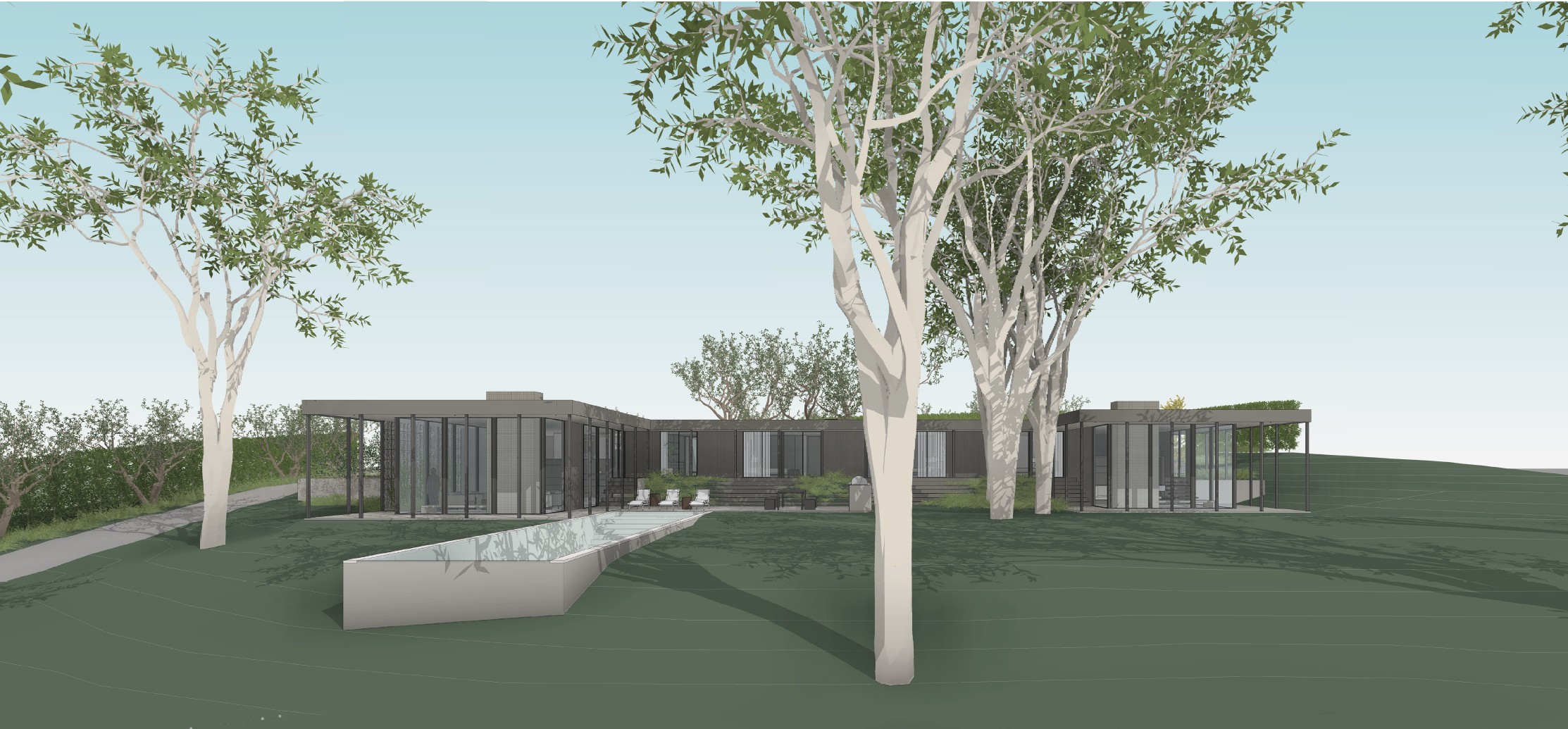 render at golden hour with soft lighting make sure landscaping is lush and green with ficus trees and eucalyptus trees conceal front face of pool with plants add a hillside with only landscaping in the background the house materials are midcentury modern dark wood