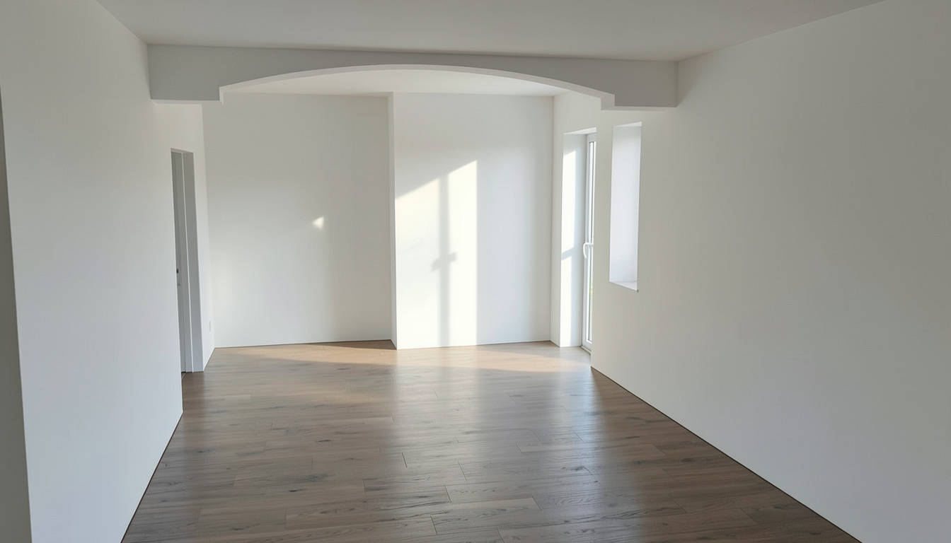 insert a minimal white ceiling cornice plaster molding 12 cm high running continuously along the entire ceiling perimeter the molding must follow all architectural elements including beams and curved sections do not change geometry walls openings or lighting only add the cornice