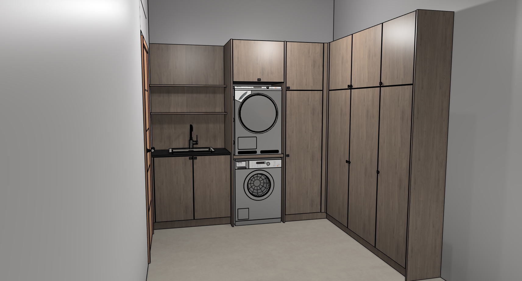 lavadero con muebles en madera roble claro tiradores pomo negro cl sico electrodom sticos acero inoxidable suelo gres color arena beig mate fregadero porcelana beig con grifo beig a ade en los estantes elementos de un lavadero