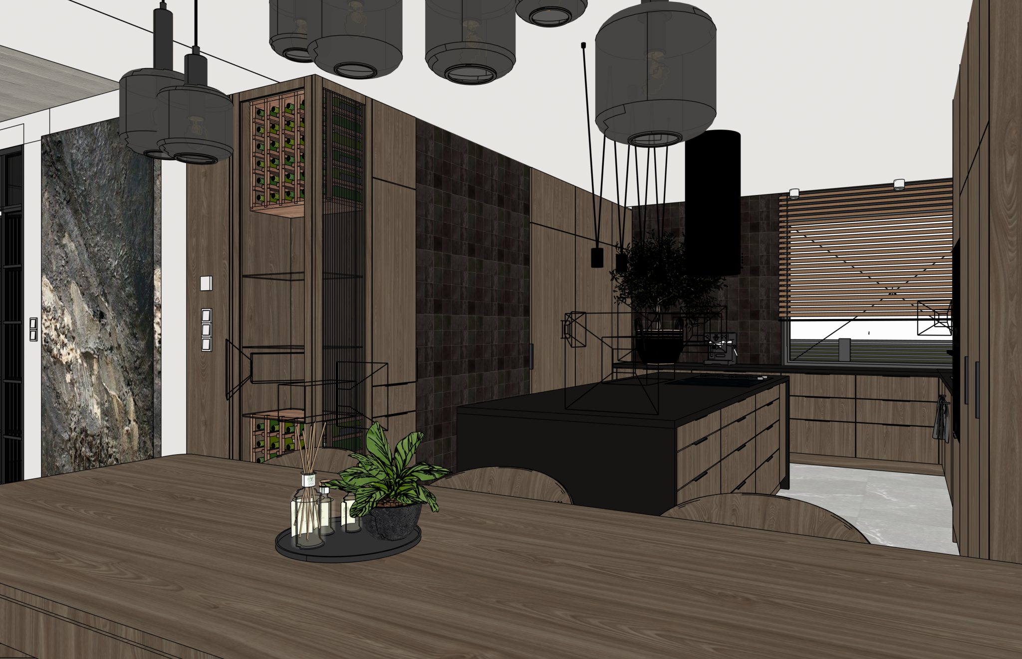 dodaj butelk bia ego wina i dwa kieliszki z bia ym winem na wyspie kuchennej dodaj par stoj c naprzeciw siebie po obu stronach wyspy kuchennej niech t par b dzie m ody przystojny m czyzna brunet z zarostem 180cm wzrostu oraz kobieta blondynka 155cm wzrostu nie oboje b d ubrani w lu ne casualowe stylizacje za oknem kuchennym znajduje si ogr d w s oneczny dzie