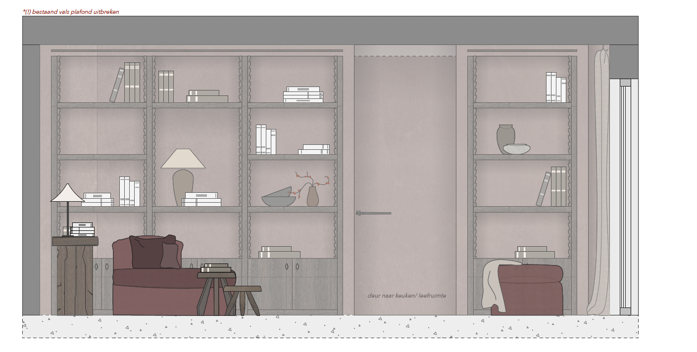 wanden ruwe schildertechniek hout oud verweerd grof hout met textuur grijzige kleur meubels oud wabi sabi stijl stof linnen natuurlijke fabric 3d beeld alsof ik in de ruimte sta meer diepte moody wazige kleuren niet te afgelikt baseer interieur op architect axel vervoordt