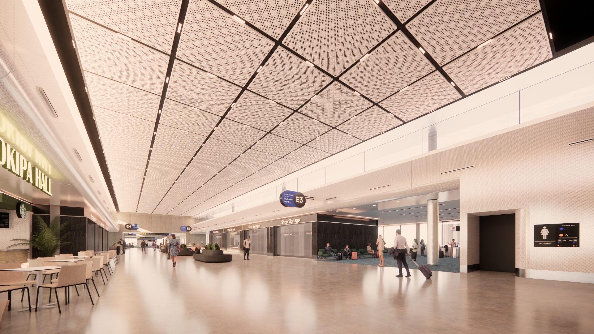 keep the ceiling panel to be white but add wood trims make the space bright and light add intricate hawaiian ilima themed elegant yellow fine mosaic art on the fascia make the scene dusk shot do not show the sun light coming into the space