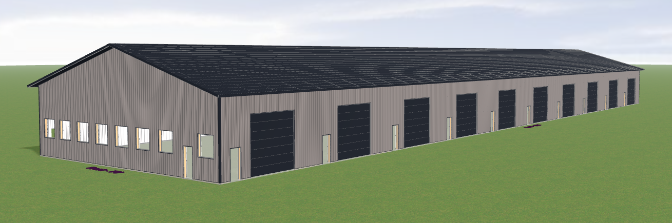 make this building look real make the window framing black and the walk doors black add decorative stone full height on the end with the windows and the same stone full height around the first walk door to the left of the overhead doors make it a sunny day with a concrete approach add stone to the whole gable end of the building around all the windows to the peak remove the stone wainscoting on the side with the overhead doors and add it full height around and above the first walk in door to the left