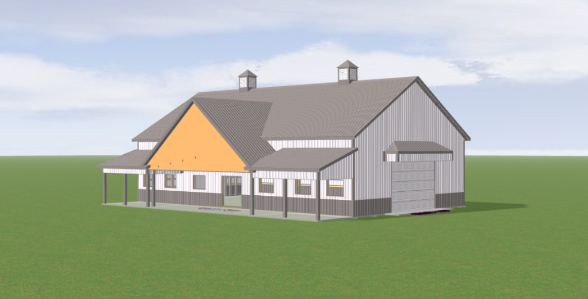 can you make this look more realistic as if taken through a camera add some rural trees in the background and a concrete driveway to the overhead door add a timber framed decorative truss in the front gable porch