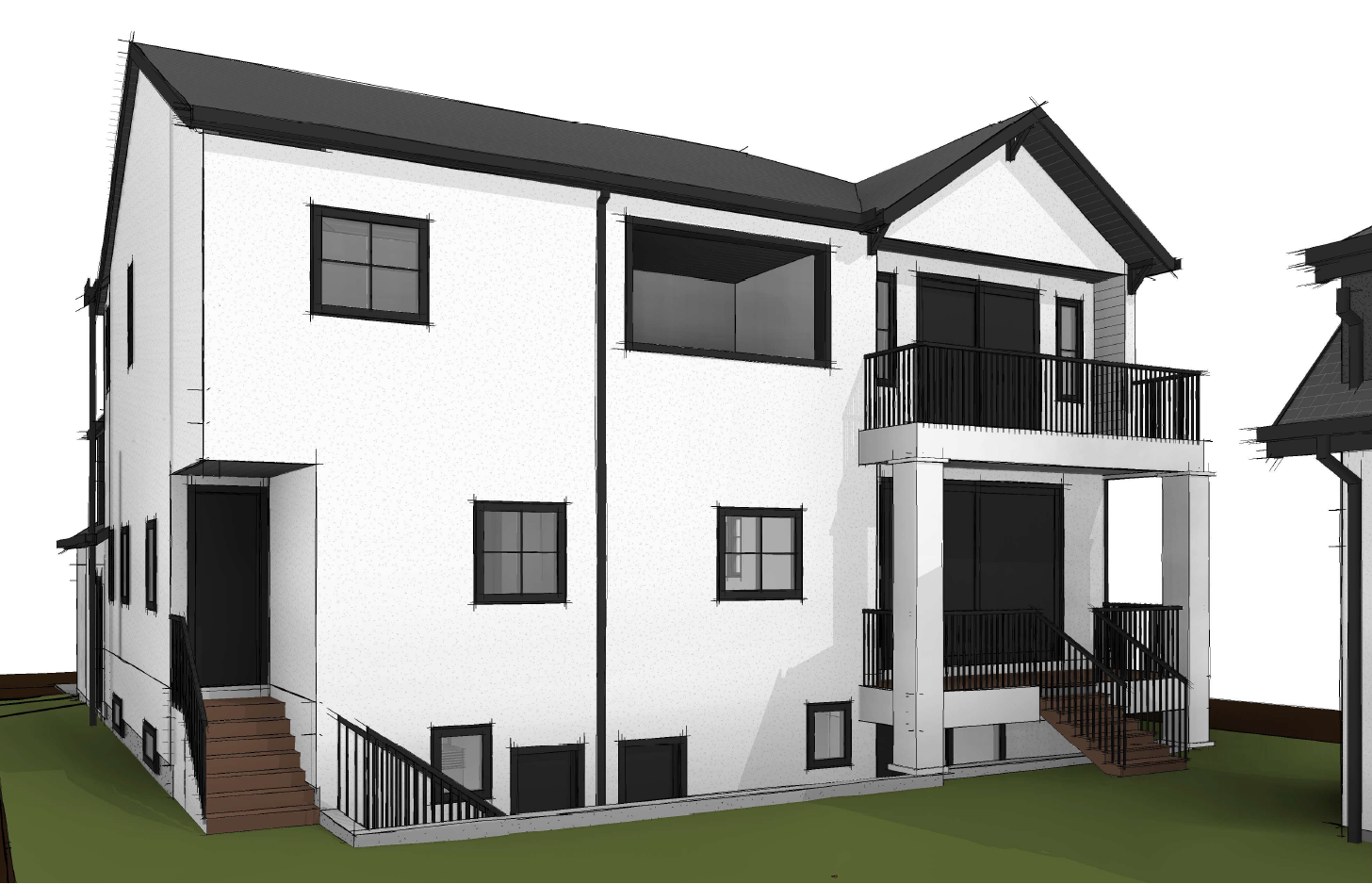 create a stunning render of a modern two story house with a sleek minimalist design the facade features a white hardie siding complementing the contemporary farmhouse style use dark slate tiles for the downspout the windows should have a reflective glass effect and the balconies should have a transparent blue tinted glass railing incorporate lush well manicured green lawns around the house set the atmosphere to a sunny day with a clear blue sky casting soft natural shadows to create depth and realism lush seattle neighbourhood landscaped with tall cedars and grasses