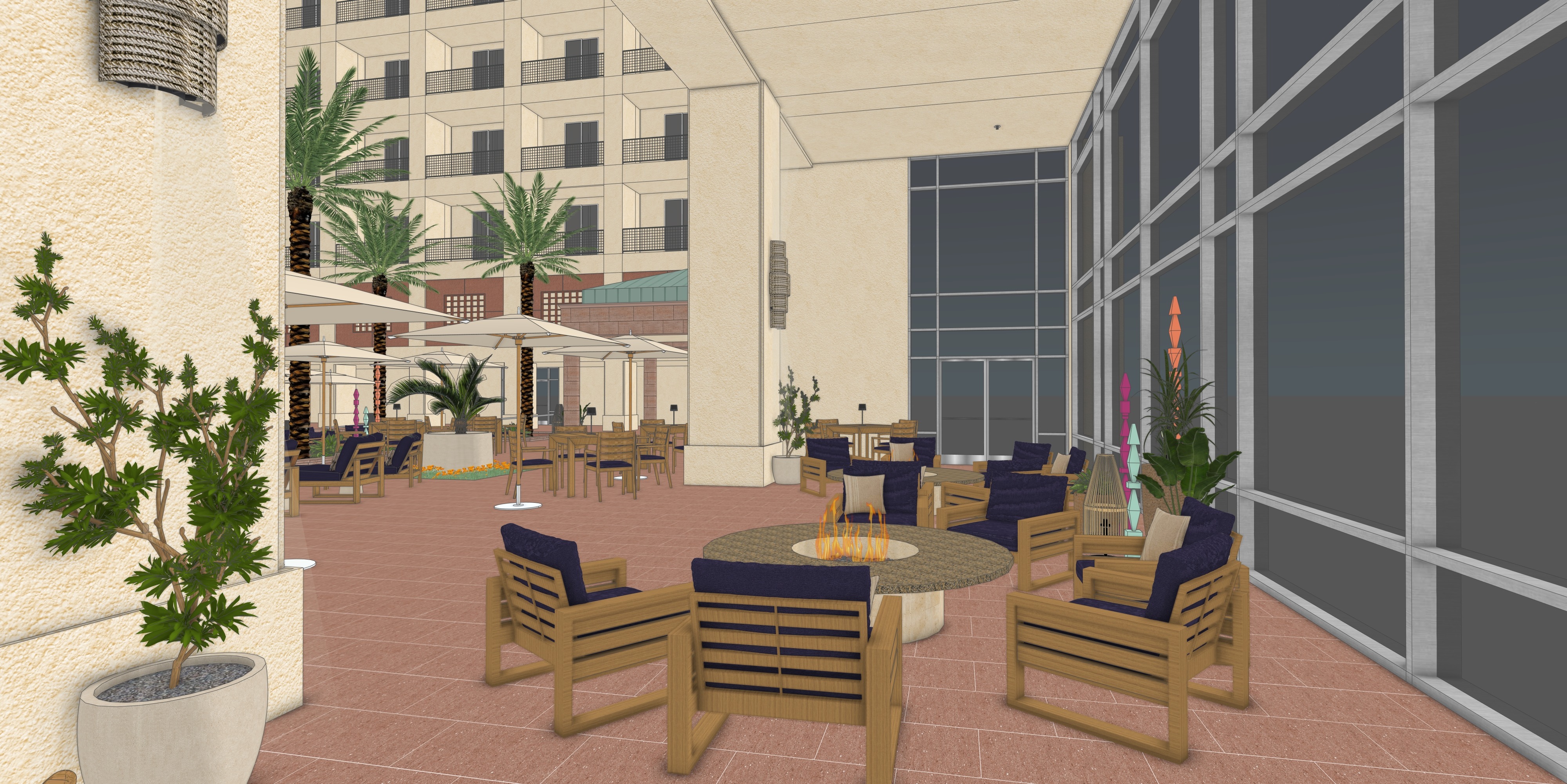 dusk view wicker lights on the columns should emit a soft glow windows on right should mainly be reflective but should emit a soft glow some windows at the balconies on the left should emit a soft glow