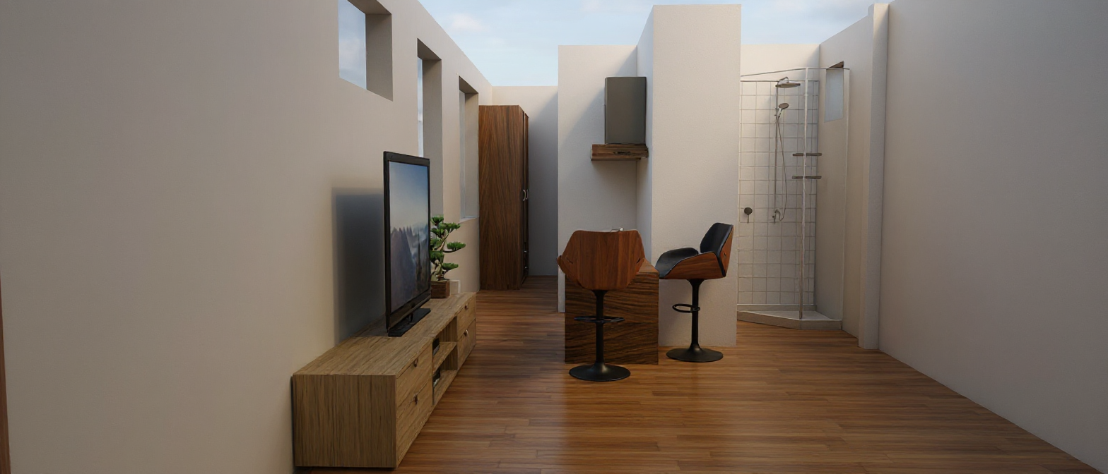realistic shot with daylight the house has a vintage aisthetic but cozy and calm the textures are realistic like lino velvet on the roof there is a false celling which lighting the roof top