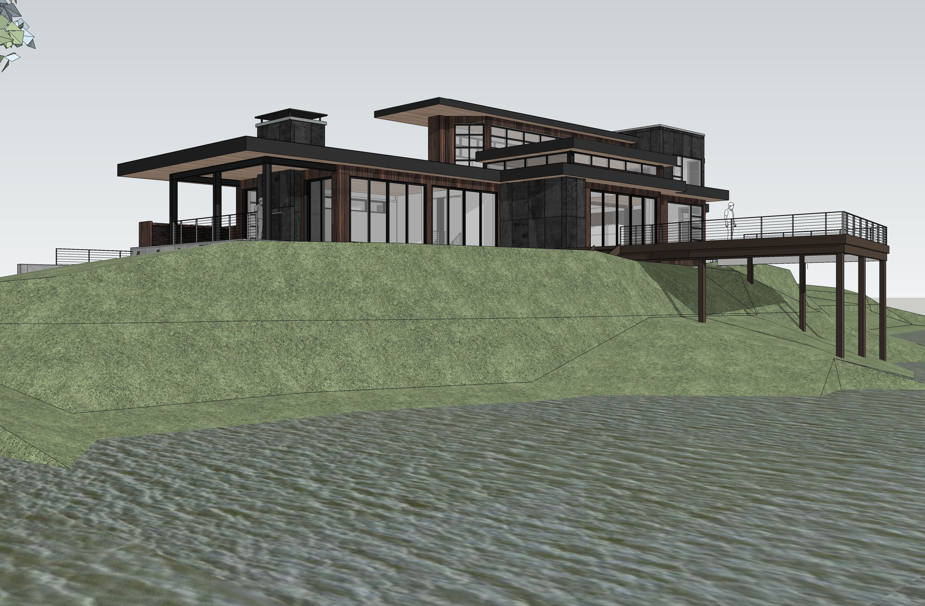 industrial home design matte wood siding wood ceiling matte black fascia matte black steel panel accent walls lake shoreline foreground fog hill with landscaping up to house