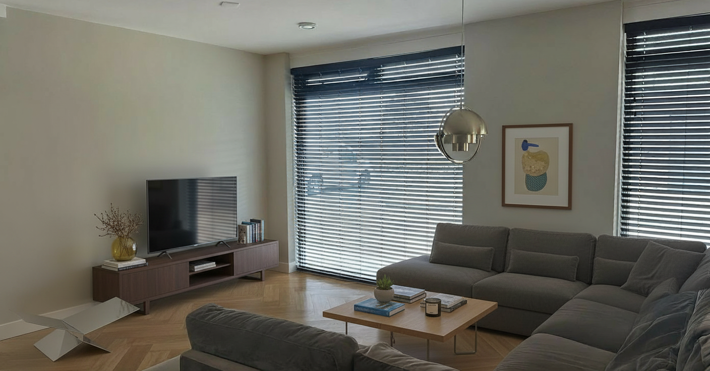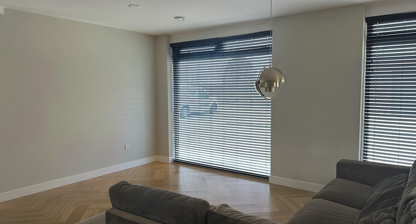 place beige curtains with ceiling rails place abstract wall art in between windows replace hanging lamp with rice paper lamp