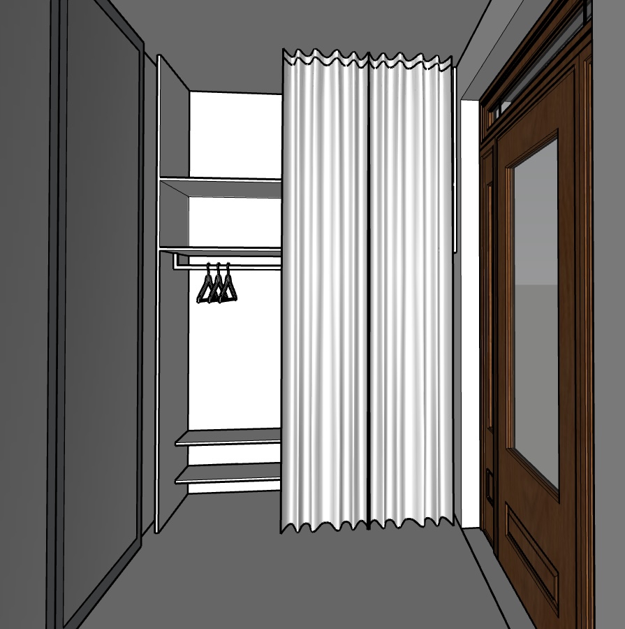 light grey floor white curtains white sealing white walls one mirror door full length front door wood